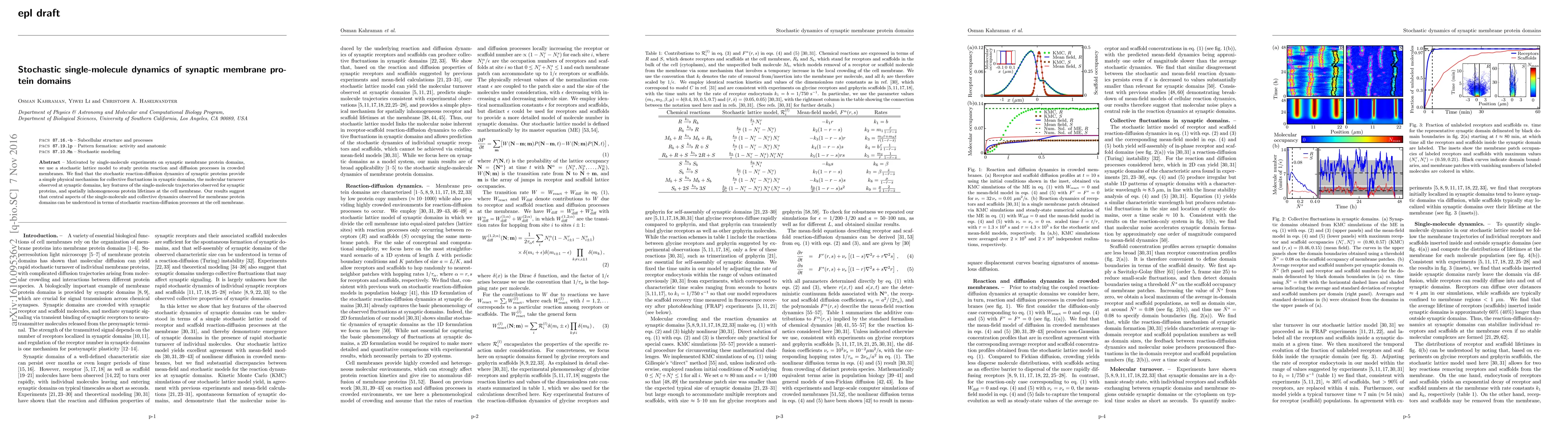 This paper employs a stochastic lattice model to investigate the reaction and diffusion dynamics of synaptic membrane protein domains, revealing that stochastic processes can explain collective fluctuations, molecular turnover, and spatially inhomogeneous protein lifetimes observed in synaptic domains. The findings suggest that these dynamics are fundamentally driven by stochastic reaction-diffusion mechanisms at the cell membrane.