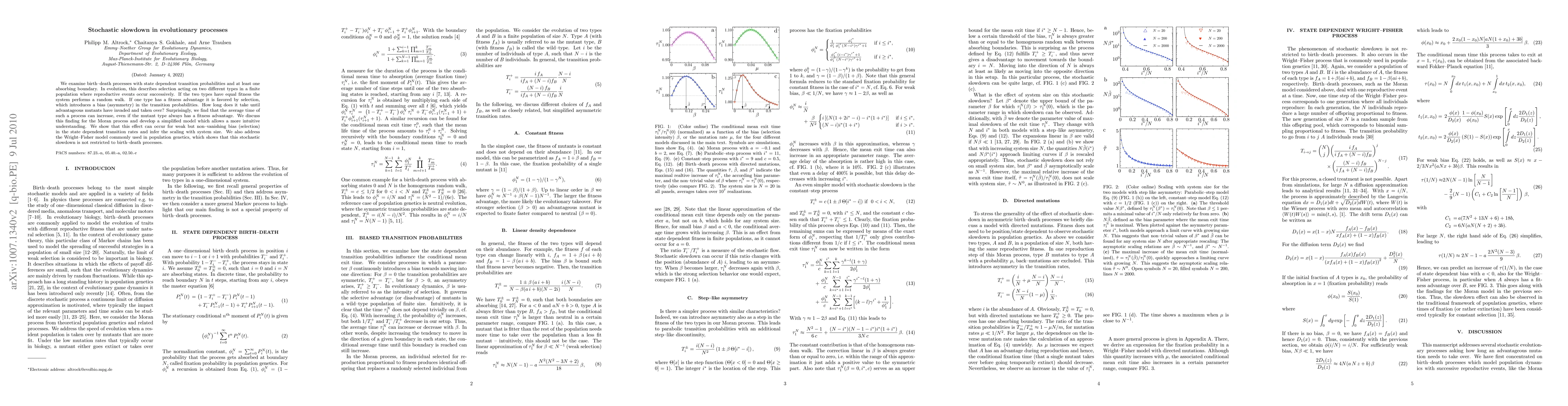 This paper explores evolutionary processes where selection favors advantageous mutants, revealing that the average time for mutants to take over can paradoxically increase despite their fitness advantage. The study uses birth-death models and finds that even a weak selection bias can cause this "stochastic slowdown," with implications for the Moran and Wright-Fisher models in population genetics.