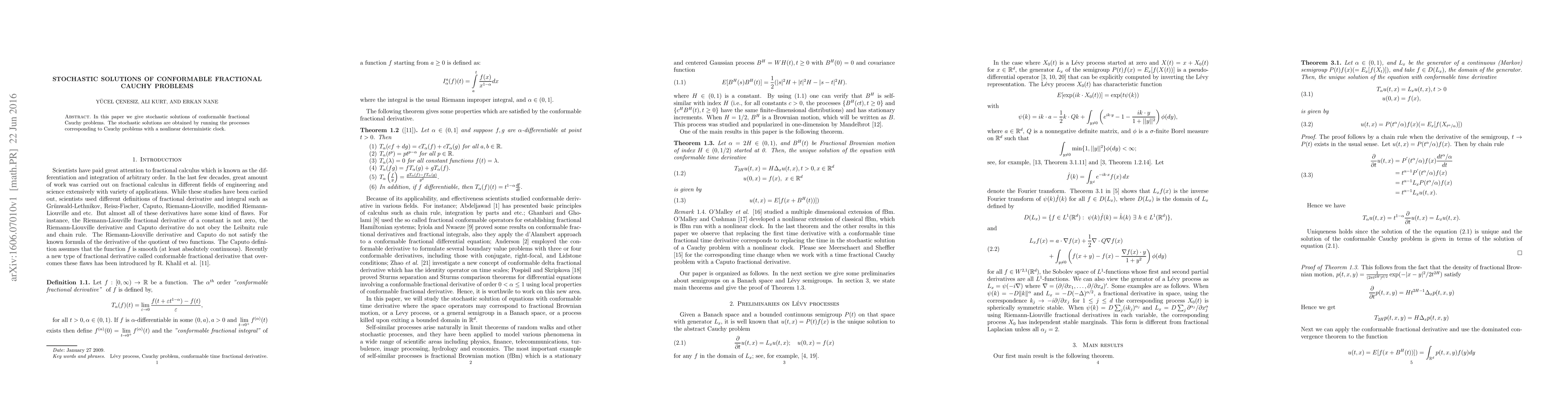 Summary: The paper presents stochastic solutions for conformable fractional Cauchy problems, achieved through processes driven by a nonlinear deterministic clock. These solutions address the complexities introduced by fractional calculus in a probabilistic framework.