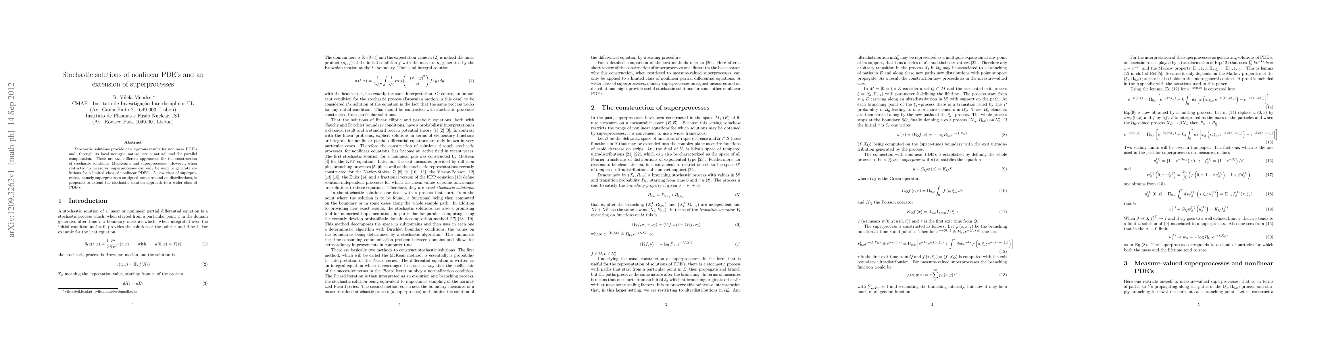 Stochastic solutions provide new rigorous results for nonlinear PDE's and, through its local non-grid nature, are a natural tool for parallel computation. There are two different approaches for the construction of stochastic solutions: MacKean's and superprocesses. However, when restricted to measures, superprocesses can only be used to generate solutions for a limited class of nonlinear PDE's. A new class of superprocesses, namely superprocesses on signed measures and on distributions, is proposed to extend the stochastic solution approach to a wider class of PDE's.