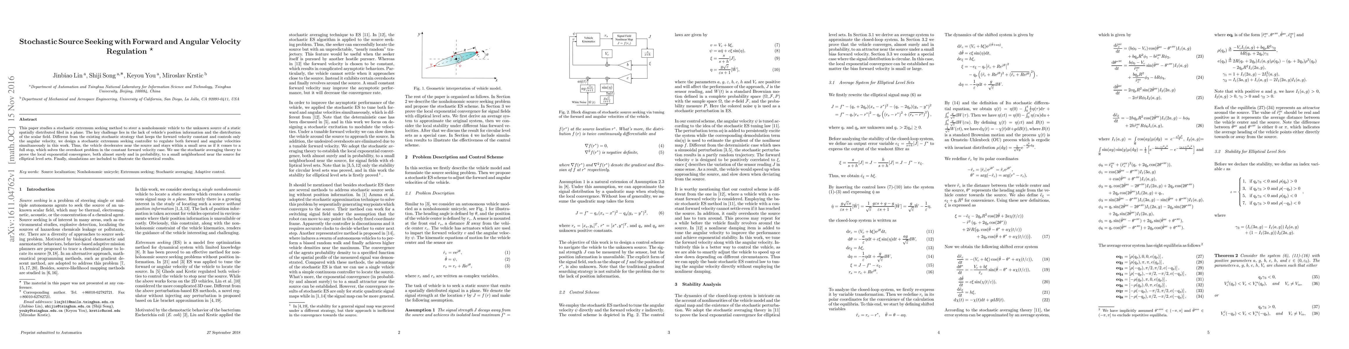 This paper proposes a stochastic extremum seeking method to guide a nonholonomic vehicle to an unknown source in a static scalar field, regulating both forward and angular velocities to prevent overshoot. Theoretical analysis using stochastic averaging proves local exponential convergence, validated by simulations.