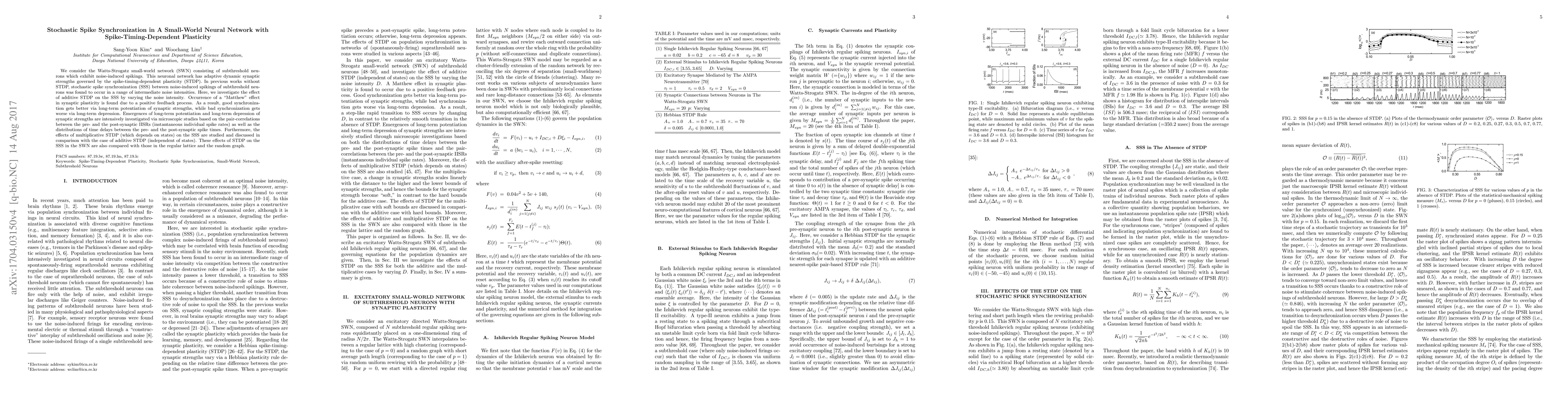 This paper investigates how spike-timing-dependent plasticity (STDP) affects stochastic spike synchronization in a small-world neural network of subthreshold neurons under varying noise intensities. It finds that STDP leads to a "Matthew effect," where good synchronization is enhanced via long-term potentiation, while poor synchronization deteriorates via long-term depression.