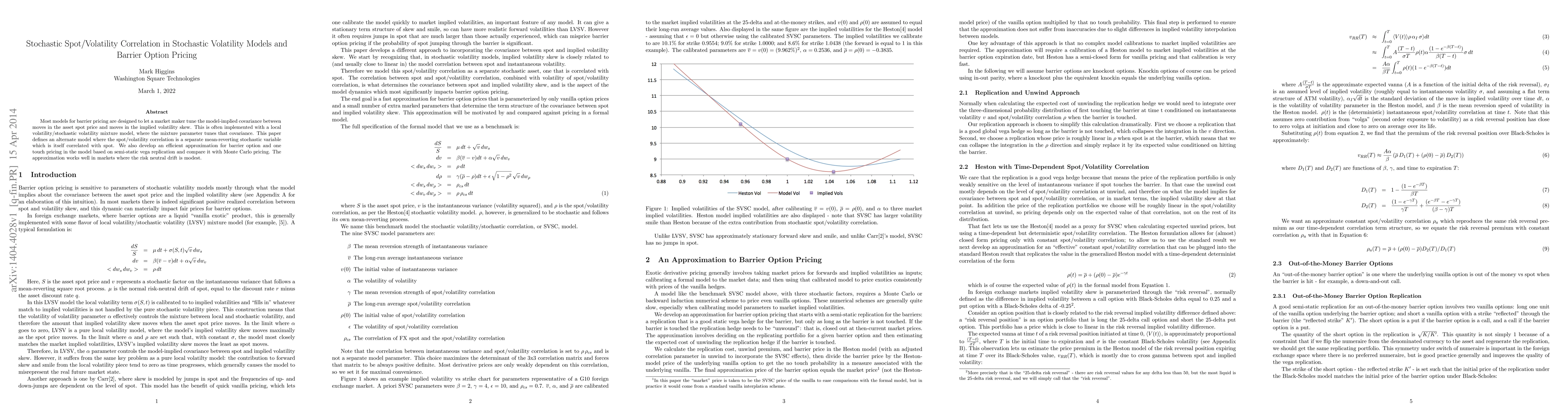 Most models for barrier pricing are designed to let a market maker tune the model-implied covariance between moves in the asset spot price and moves in the implied volatility skew. This is often implemented with a local volatility/stochastic volatility mixture model, where the mixture parameter tunes that covariance. This paper defines an alternate model where the spot/volatility correlation is a separate mean-reverting stochastic variable which is itself correlated with spot. We also develop an efficient approximation for barrier option and one touch pricing in the model based on semi-static vega replication and compare it with Monte Carlo pricing. The approximation works well in markets where the risk neutral drift is modest.