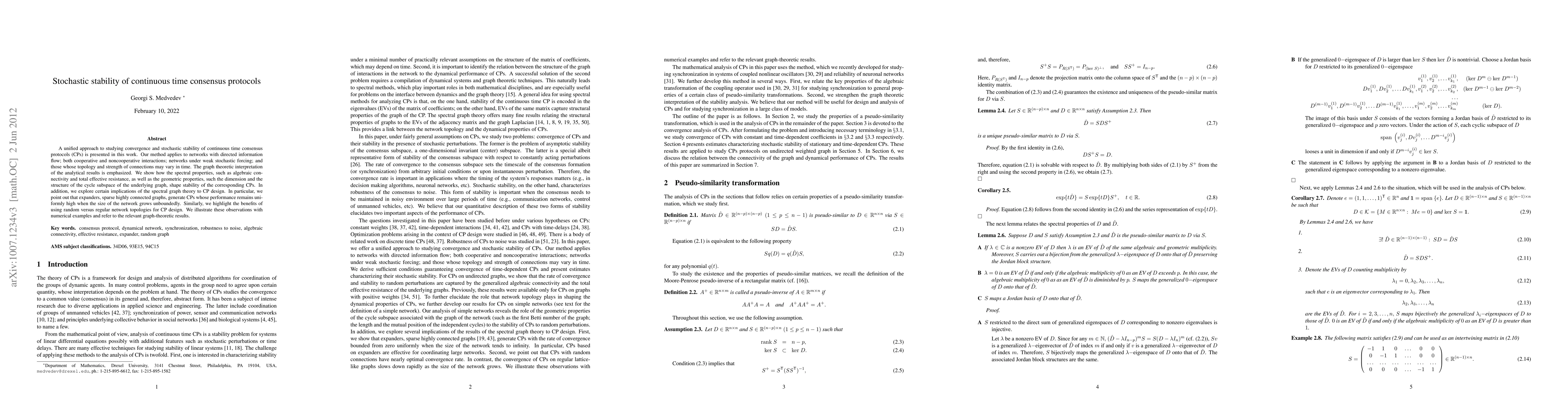 This paper presents a unified approach to studying convergence and stochastic stability of continuous time consensus protocols in networks with various topologies and interactions. It highlights the benefits of using expanders and random graph topologies for robust design.