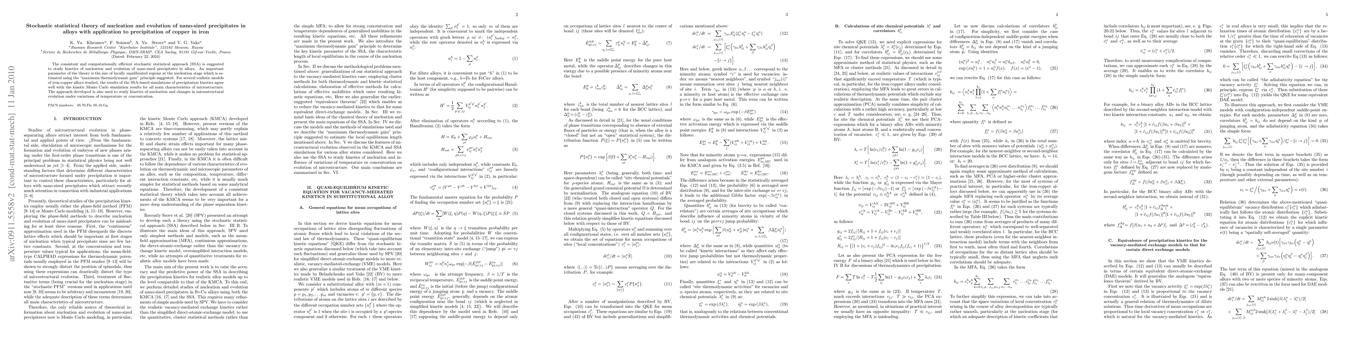 A stochastic statistical approach (SSA) is developed for studying the kinetics of nucleation and evolution of nano-sized precipitates in alloys, particularly focusing on copper precipitation in iron. The approach uses the 'maximum thermodynamic gain' principle to estimate the size of locally equilibrated regions during nucleation.
