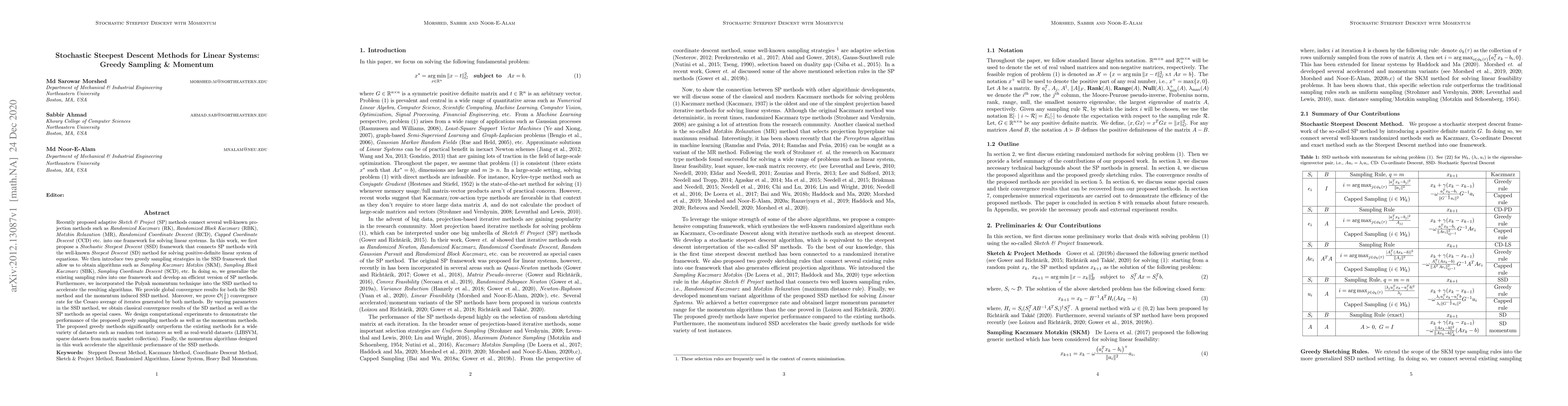 Recently proposed adaptive Sketch & Project (SP) methods connect several well-known projection methods such as Randomized Kaczmarz (RK), Randomized Block Kaczmarz (RBK), Motzkin Relaxation (MR), Randomized Coordinate Descent (RCD), Capped Coordinate Descent (CCD), etc. into one framework for solving linear systems. In this work, we first propose a Stochastic Steepest Descent (SSD) framework that connects SP methods with the well-known Steepest Descent (SD) method for solving positive-definite linear system of equations. We then introduce two greedy sampling strategies in the SSD framework that allow us to obtain algorithms such as Sampling Kaczmarz Motzkin (SKM), Sampling Block Kaczmarz (SBK), Sampling Coordinate Descent (SCD), etc. In doing so, we generalize the existing sampling rules into one framework and develop an efficient version of SP methods. Furthermore, we incorporated the Polyak momentum technique into the SSD method to accelerate the resulting algorithms. We provide global convergence results for both the SSD method and the momentum induced SSD method. Moreover, we prove $\mathcal{O}(\frac{1}{k})$ convergence rate for the Cesaro average of iterates generated by both methods. By varying parameters in the SSD method, we obtain classical convergence results of the SD method as well as the SP methods as special cases. We design computational experiments to demonstrate the performance of the proposed greedy sampling methods as well as the momentum methods. The proposed greedy methods significantly outperform the existing methods for a wide variety of datasets such as random test instances as well as real-world datasets (LIBSVM, sparse datasets from matrix market collection). Finally, the momentum algorithms designed in this work accelerate the algorithmic performance of the SSD methods.