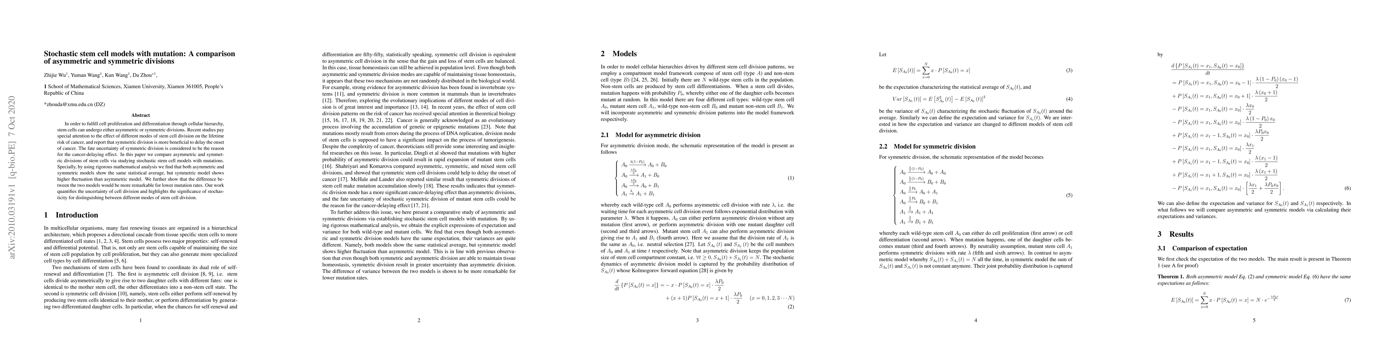 In order to fulfill cell proliferation and differentiation through cellular hierarchy, stem cells can undergo either asymmetric or symmetric divisions. Recent studies pay special attention to the effect of different modes of stem cell division on the lifetime risk of cancer, and report that symmetric division is more beneficial to delay the onset of cancer. The fate uncertainty of symmetric division is considered to be the reason for the cancer-delaying effect. In this paper we compare asymmetric and symmetric divisions of stem cells via studying stochastic stem cell models with mutations. Specially, by using rigorous mathematical analysis we find that both asymmetric and symmetric models show the same statistical average, but symmetric model shows higher fluctuation than asymmetric model. We further show that the difference between the two models would be more remarkable for lower mutation rates. Our work quantifies the uncertainty of cell division and highlights the significance of stochasticity for distinguishing between different modes of stem cell division.