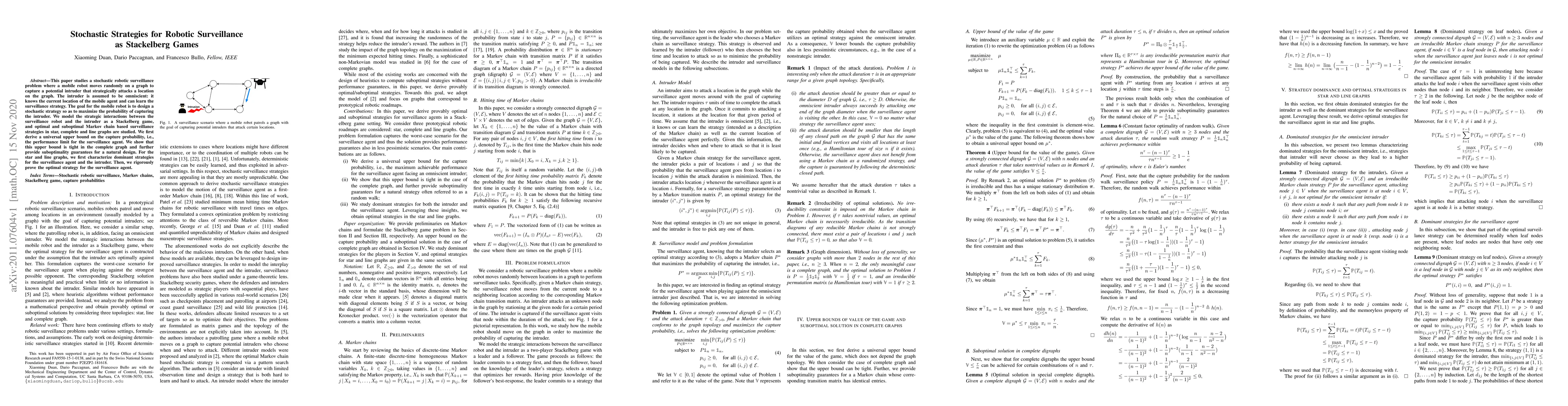 This paper explores stochastic surveillance strategies for a mobile robot modeled as a Stackelberg game against an omniscient intruder. It derives optimal and suboptimal Markov chain strategies for star, complete, and line graphs, establishing a tight upper bound on capture probability for complete graphs and proving optimal strategies for other graph types.