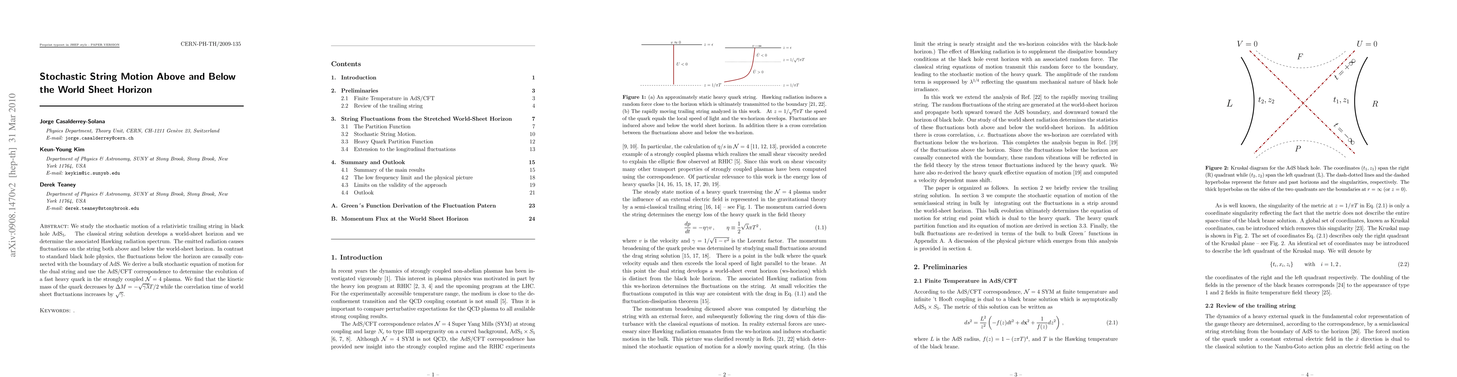 This paper investigates the stochastic motion of a relativistic string in black hole AdS_5, revealing a world-sheet horizon and associated Hawking radiation. The study finds that fluctuations both above and below the horizon are causally linked to the AdS boundary, leading to a bulk stochastic equation for the string and a decrease in the kinetic mass of a fast heavy quark in the $\N=4$ plasma by $\Delta M=-\sqrt{\gamma \lambda}T/2$.