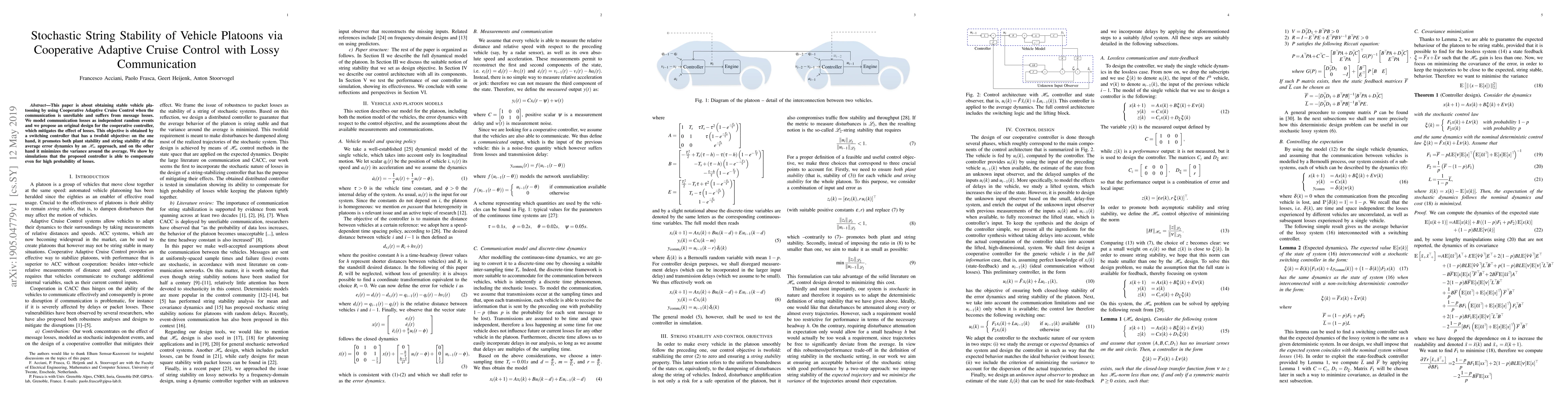 This paper is about obtaining stable vehicle platooning by using Cooperative Adaptive Cruise Control when the communication is unreliable and suffers from message losses. We model communication losses as independent random events and we propose an original design for the cooperative controller, which mitigates the effect of losses. This objective is obtained by a switching controller that has a twofold objective: on the one hand, it promotes both plant stability and string stability of the average error dynamics by an $H_infty$ approach, and on the other hand it minimizes the variance around the average. We show by simulations that the proposed controller is able to compensate even for high probability of losses.
