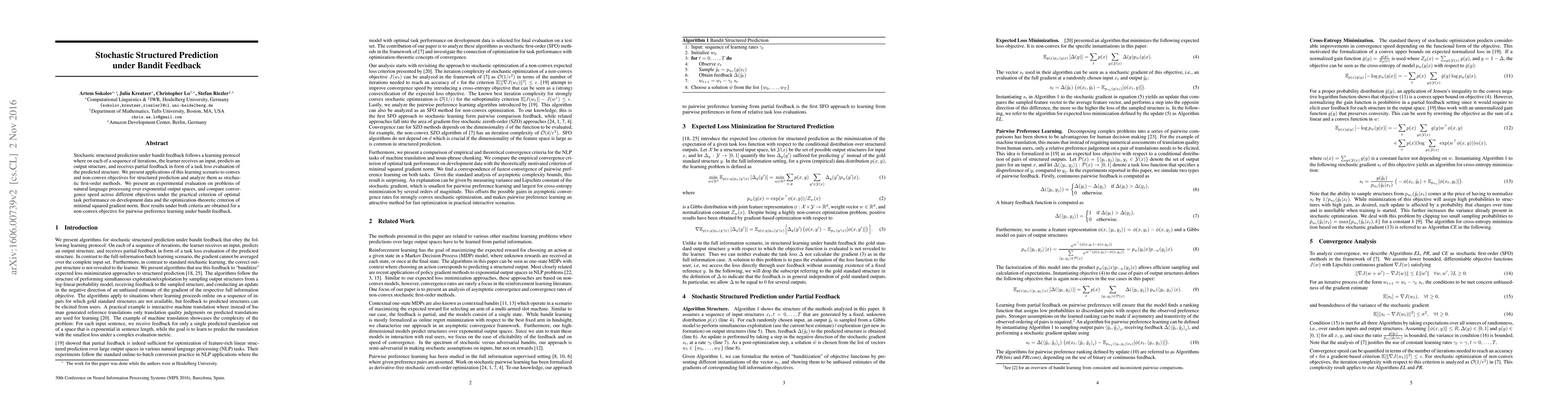 This paper investigates stochastic structured prediction using bandit feedback, applying it to both convex and non-convex objectives for structured prediction. Experimental results on NLP tasks show that a non-convex objective performs best in terms of task performance and minimal squared gradient norm.