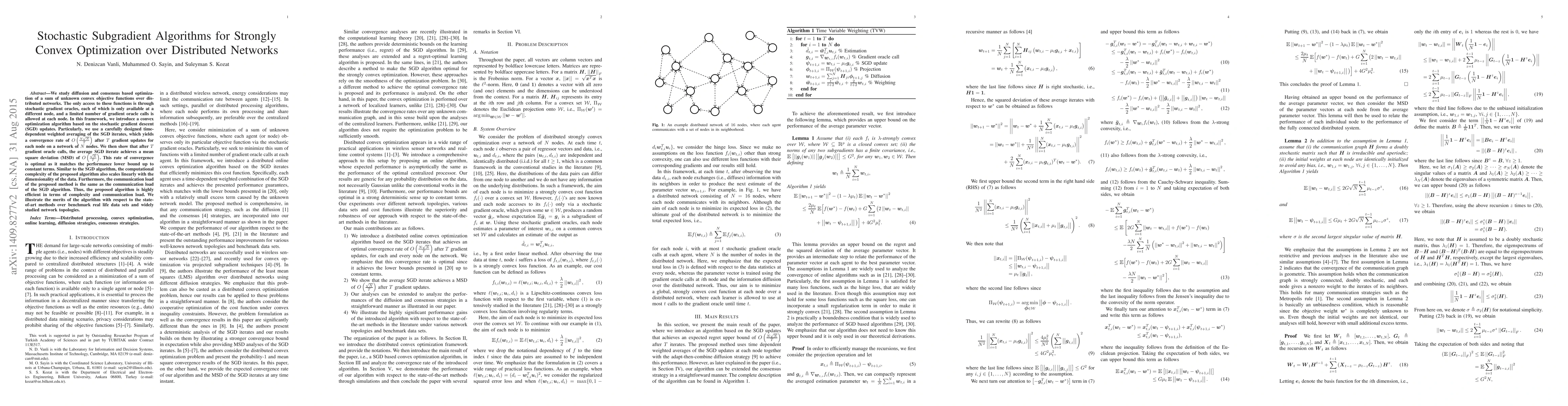 We study diffusion and consensus based optimization of a sum of unknown convex objective functions over distributed networks. The only access to these functions is through stochastic gradient oracles, each of which is only available at a different node, and a limited number of gradient oracle calls is allowed at each node. In this framework, we introduce a convex optimization algorithm based on the stochastic gradient descent (SGD) updates. Particularly, we use a carefully designed time-dependent weighted averaging of the SGD iterates, which yields a convergence rate of $O\left(\frac{N\sqrt{N}}{T}\right)$ after $T$ gradient updates for each node on a network of $N$ nodes. We then show that after $T$ gradient oracle calls, the average SGD iterate achieves a mean square deviation (MSD) of $O\left(\frac{\sqrt{N}}{T}\right)$. This rate of convergence is optimal as it matches the performance lower bound up to constant terms. Similar to the SGD algorithm, the computational complexity of the proposed algorithm also scales linearly with the dimensionality of the data. Furthermore, the communication load of the proposed method is the same as the communication load of the SGD algorithm. Thus, the proposed algorithm is highly efficient in terms of complexity and communication load. We illustrate the merits of the algorithm with respect to the state-of-art methods over benchmark real life data sets and widely studied network topologies.