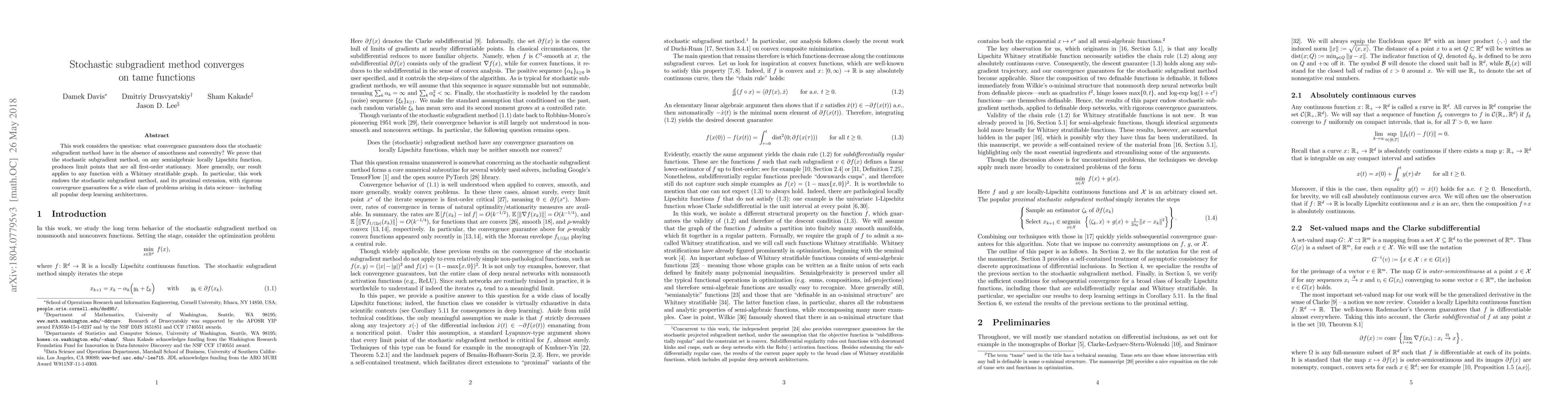 This paper proves that the stochastic subgradient method converges to first-order stationary points for semialgebraic, locally Lipschitz functions and more generally for functions with Whitney stratifiable graphs, providing rigorous convergence guarantees for a broad range of data science applications, including deep learning.