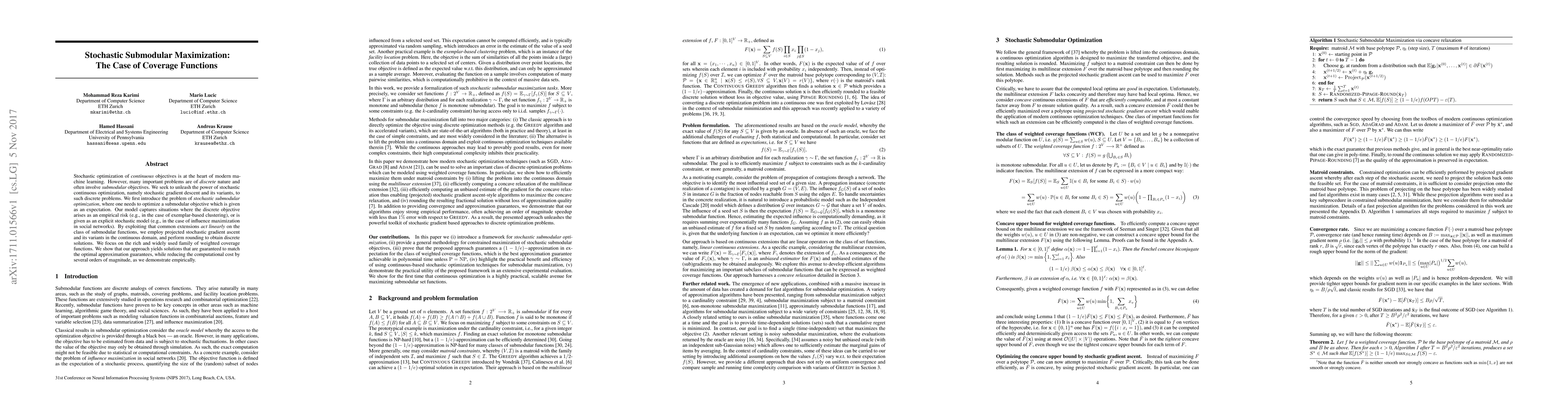 This paper explores stochastic optimization techniques for maximizing submodular objectives, particularly in the context of coverage functions. It leverages continuous stochastic gradient ascent methods and rounding techniques to achieve optimal approximation guarantees with significantly reduced computational costs.