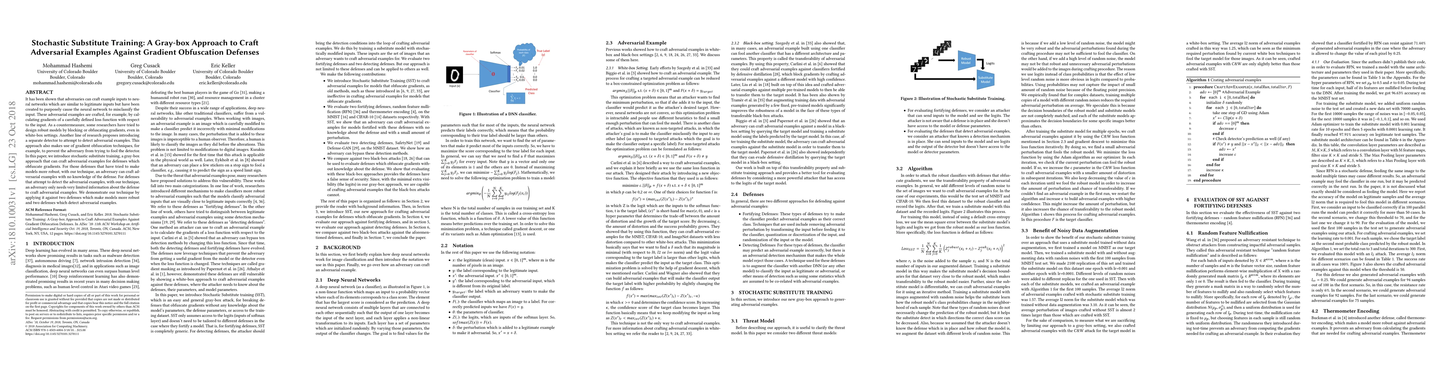 This paper presents stochastic substitute training, a gray-box method to generate adversarial examples against gradient obfuscation defenses, enabling adversaries to craft such examples without full knowledge of the defense mechanisms. The technique is demonstrated against both defenses that enhance model robustness and those that detect adversarial inputs.