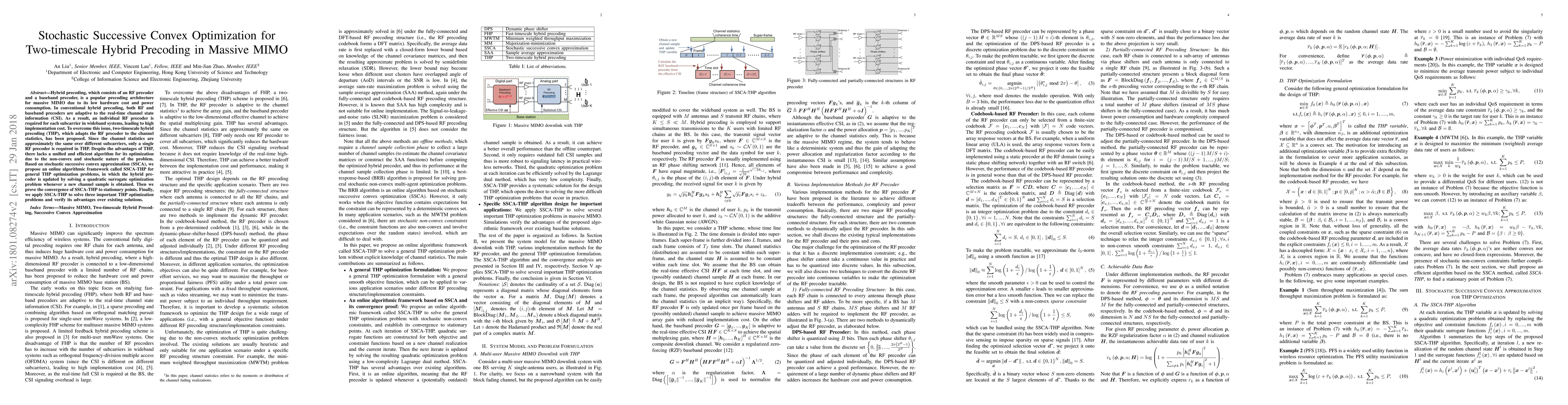 This paper proposes an SSCA-THP algorithm for optimizing two-timescale hybrid precoding in massive MIMO systems, addressing the non-convex and stochastic nature of the optimization problem. The algorithm updates the hybrid precoder by solving a quadratic surrogate optimization problem, demonstrating convergence to stationary points and outperforming existing solutions in practical scenarios.