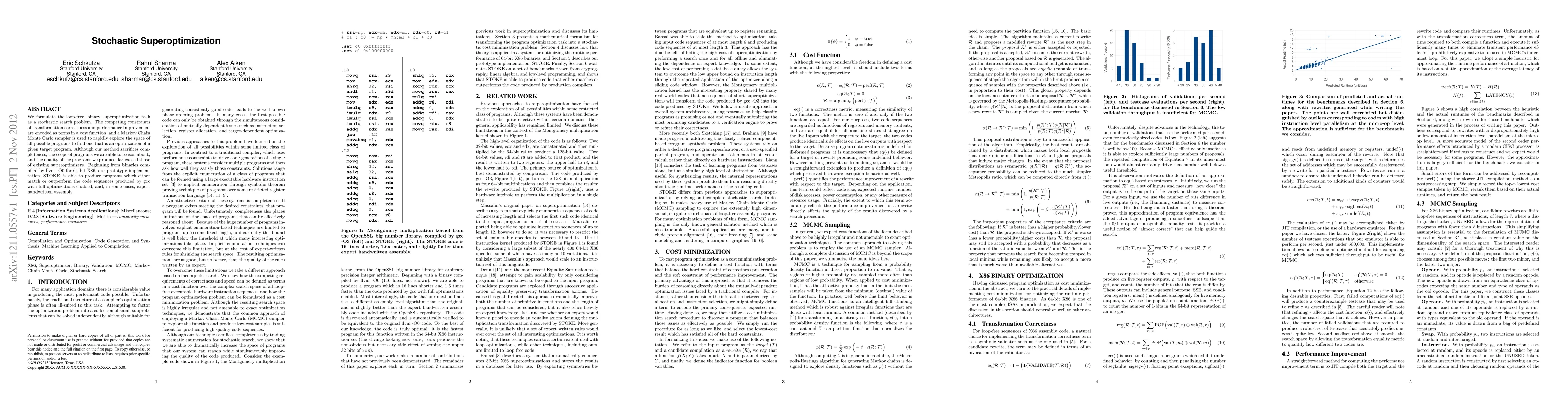 This paper proposes a stochastic search method for superoptimization of loop-free binary programs, balancing transformation correctness and performance. Using a Markov Chain Monte Carlo sampler, the method explores program spaces to find optimized versions of target programs, achieving superior results compared to existing superoptimizers.
