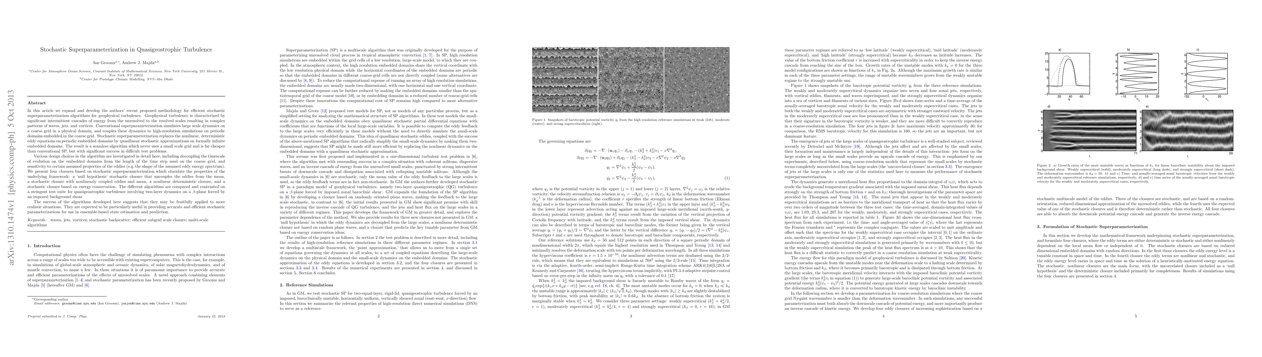 In this article we expand and develop the authors' recent proposed methodology for efficient stochastic superparameterization (SP) algorithms for geophysical turbulence. Geophysical turbulence is characterized by significant intermittent cascades of energy from the unresolved to the resolved scales resulting in complex patterns of waves, jets, and vortices. Conventional SP simulates large scale dynamics on a coarse grid in a physical domain, and couples these dynamics to high-resolution simulations on periodic domains embedded in the coarse grid. Stochastic SP replaces the nonlinear, deterministic eddy equations on periodic embedded domains by quasilinear stochastic approximations on formally infinite embedded domains. The result is a seamless algorithm which never uses a small scale grid and is far cheaper than conventional SP, but with significant success in difficult test problems. Various design choices in the algorithm are investigated in detail here, including decoupling the timescale of evolution on the embedded domains from the length of the time step used on the coarse grid, and sensitivity to certain assumed properties of the eddies (e.g. the shape of the assumed eddy energy spectrum). The different design choices are compared and contrasted on a stringent test suite for quasigeostrophic turbulence involving two-layer dynamics on a beta-plane forced by an imposed background shear. The algorithms developed are expected to be particularly useful in providing accurate and efficient stochastic parameterizations for use in ensemble-based state estimation and prediction.