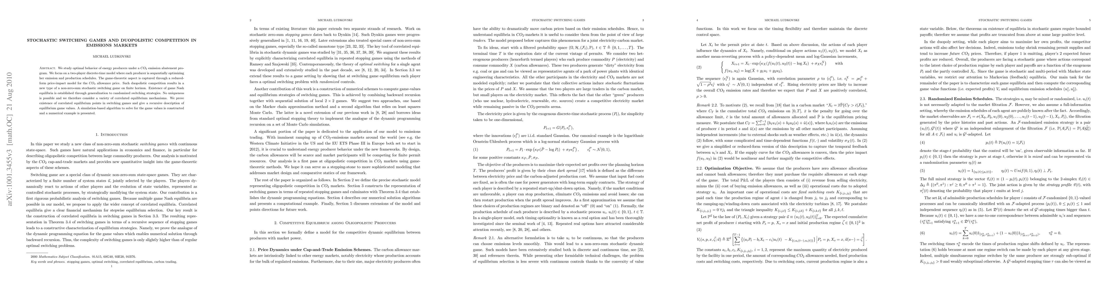 We study optimal behavior of energy producers under a CO_2 emission abatement program. We focus on a two-player discrete-time model where each producer is sequentially optimizing her emission and production schedules. The game-theoretic aspect is captured through a reduced-form price-impact model for the CO_2 allowance price. Such duopolistic competition results in a new type of a non-zero-sum stochastic switching game on finite horizon. Existence of game Nash equilibria is established through generalization to randomized switching strategies. No uniqueness is possible and we therefore consider a variety of correlated equilibrium mechanisms. We prove existence of correlated equilibrium points in switching games and give a recursive description of equilibrium game values. A simulation-based algorithm to solve for the game values is constructed and a numerical example is presented.