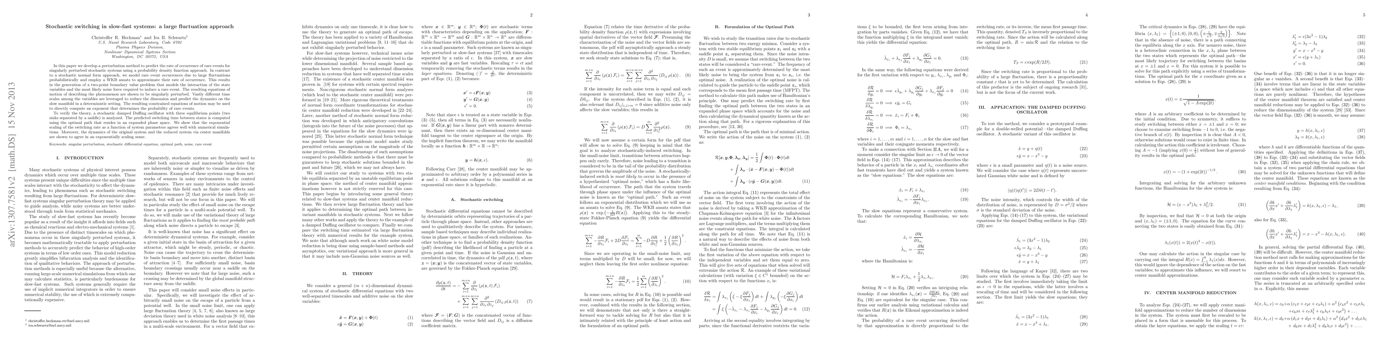 In this paper we develop a perturbation method to predict the rate of occurrence of rare events for singularly perturbed stochastic systems using a probability density function approach. In contrast to a stochastic normal form approach, we model rare event occurrences due to large fluctuations probabilistically and employ a WKB ansatz to approximate their rate of occurrence. This results in the generation of a two-point boundary value problem that models the interaction of the state variables and the most likely noise force required to induce a rare event. The resulting equations of motion of describing the phenomenon are shown to be singularly perturbed. Vastly different time scales among the variables are leveraged to reduce the dimension and predict the dynamics on the slow manifold in a deterministic setting. The resulting constrained equations of motion may be used to directly compute an exponent that determines the probability of rare events. To verify the theory, a stochastic damped Duffing oscillator with three equilibrium points (two sinks separated by a saddle) is analyzed. The predicted switching time between states is computed using the optimal path that resides in an expanded phase space. We show that the exponential scaling of the switching rate as a function of system parameters agrees well with numerical simulations. Moreover, the dynamics of the original system and the reduced system via center manifolds are shown to agree in an exponentially scaling sense.