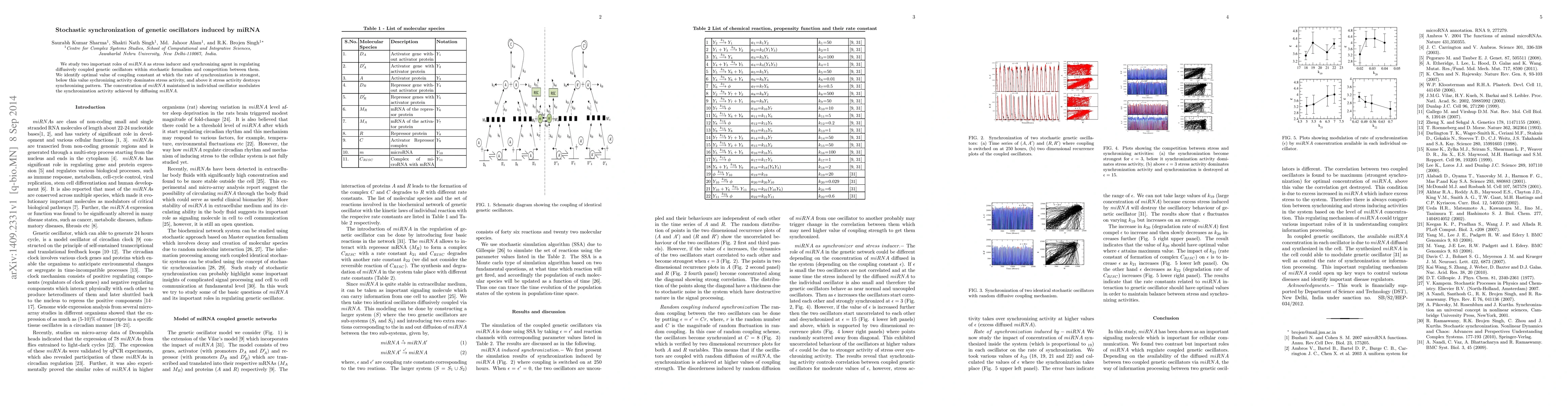 This paper investigates how miRNA acts as both a stress inducer and a synchronizing agent in stochastically coupled genetic oscillators, identifying the optimal coupling constant for synchronization. It finds that below this constant, synchronization prevails, while above it, stress activity disrupts synchronization.