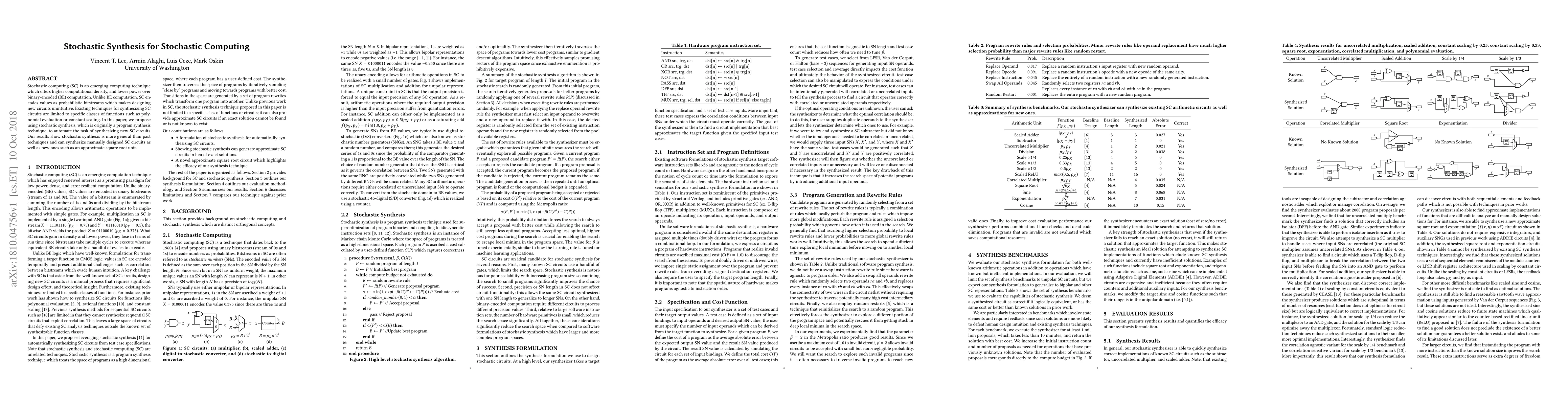 This paper proposes stochastic synthesis for automating the design of stochastic computing circuits, which encode values as probabilistic bitstreams. Unlike existing methods, stochastic synthesis is shown to be more general and capable of creating both new and manually designed SC circuits, including an approximate square root unit.