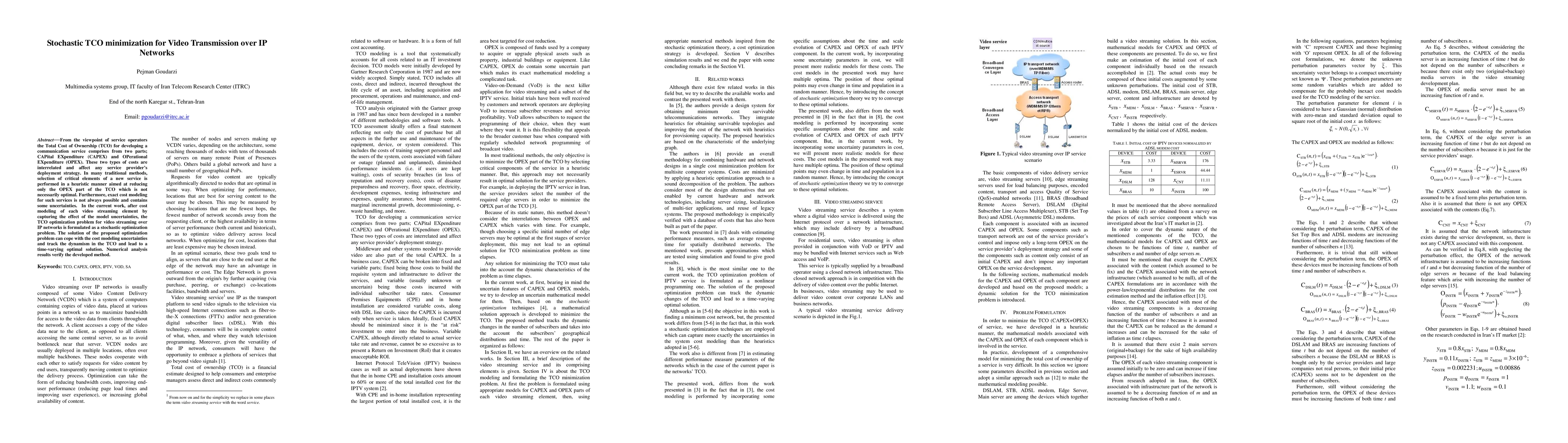 From the viewpoint of service operators the Total Cost of Ownership (TCO) for developing a communication service comprises from two parts; CAPital EXpenditure (CAPEX) and OPerational EXpenditure (OPEX). These two types of costs are interrelated and affect any service provider's deployment strategy. In many traditional methods, selection of critical elements of a new service is performed in a heuristic manner aimed at reducing only the OPEX part of the TCO which is not necessarily optimal. Furthermore, exact cost modeling for such services is not always possible and contains some uncertainties. In the current work, after cost modeling of each video streaming element by capturing the effect of the model uncertainties, the TCO optimization problem for video streaming over IP networks is formulated as a stochastic optimization problem. The solution of the proposed optimization problem can cope with the cost modeling uncertainties and track the dynamism in the TCO and lead to a time-varying optimal solution. Numerical analysis results verify the developed method.