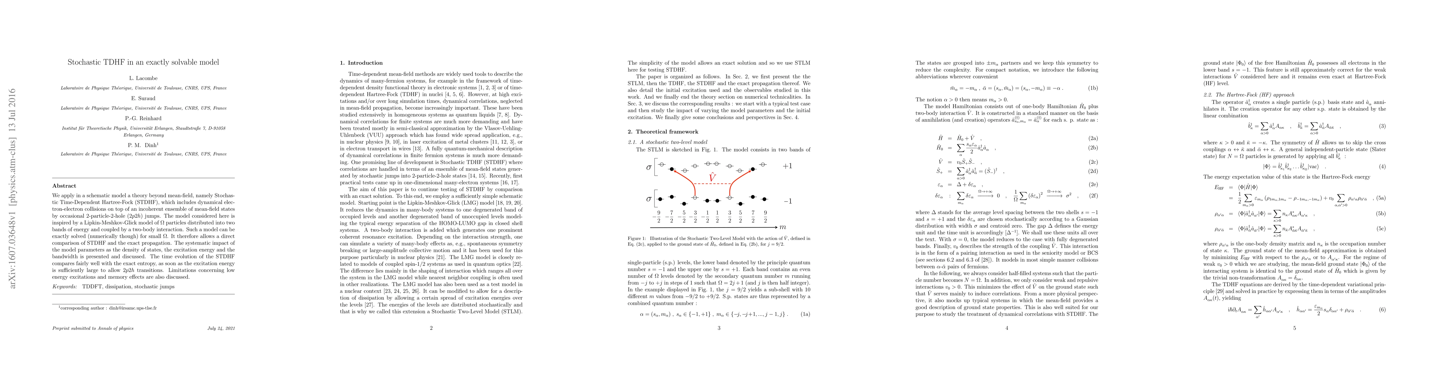 We apply in a schematic model a theory beyond mean-field, namely Stochastic Time-Dependent Hartree-Fock (STDHF), which includes dynamical electron-electron collisions on top of an incoherent ensemble of mean-field states by occasional 2-particle-2-hole ($2p2h$) jumps. The model considered here is inspired by a Lipkin-Meshkov-Glick model of $\Omega$ particles distributed into two bands of energy and coupled by a two-body interaction. Such a model can be exactly solved (numerically though) for small $\Omega$. It therefore allows a direct comparison of STDHF and the exact propagation. The systematic impact of the model parameters as the density of states, the excitation energy and the bandwidth is presented and discussed. The time evolution of the STDHF compares fairly well with the exact entropy, as soon as the excitation energy is sufficiently large to allow $2p2h$ transitions. Limitations concerning low energy excitations and memory effects are also discussed.