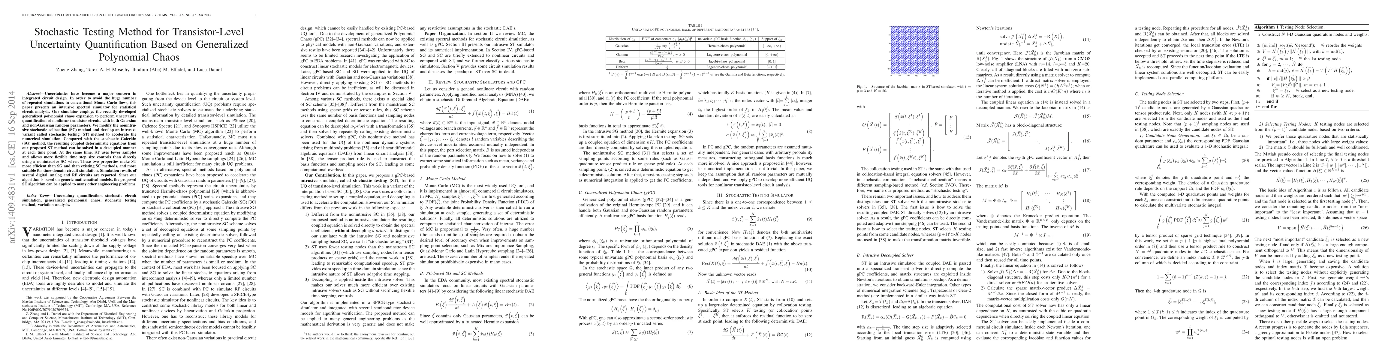 This paper introduces an intrusive stochastic testing method based on generalized polynomial chaos for efficient uncertainty quantification in transistor-level circuit simulations. The proposed method accelerates numerical simulations by decoupling the solution process and using fewer samples compared to stochastic Galerkin and nonintrusive stochastic collocation methods.