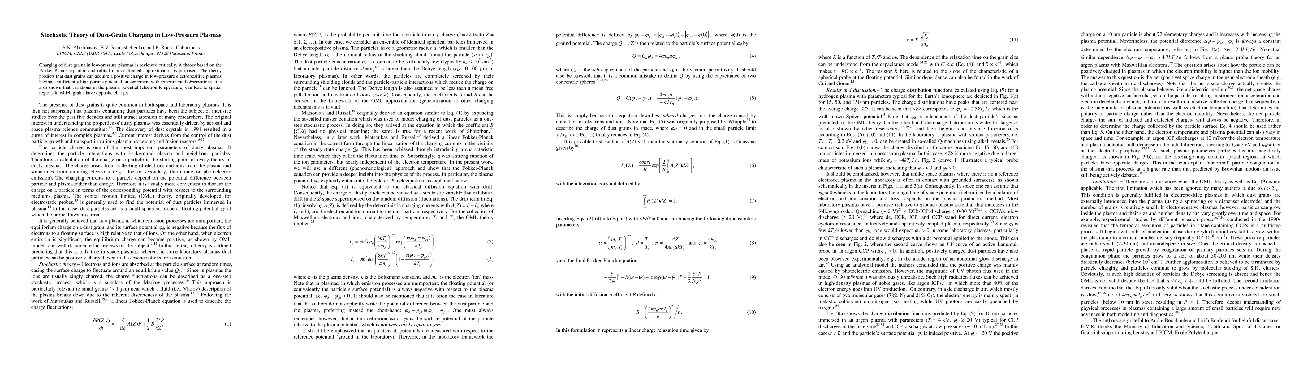 This paper proposes a stochastic theory for dust-grain charging in low-pressure plasmas using the Fokker-Planck equation and orbital motion limited approximation, predicting positive charge acquisition under certain plasma conditions and potential charge reversal due to plasma potential variations.