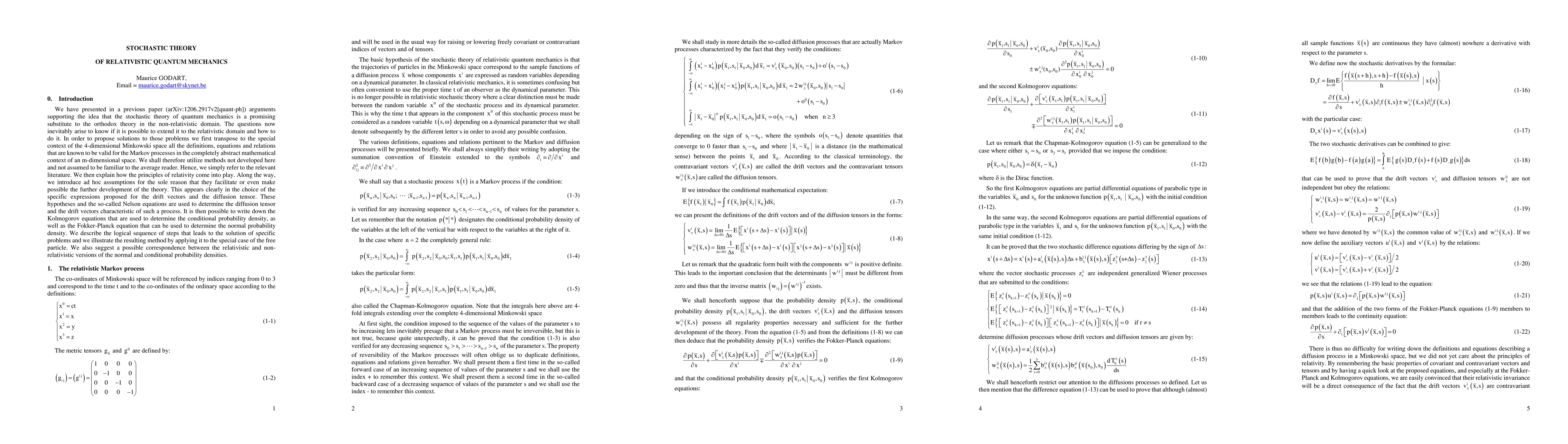 The stochastic theory of relativistic quantum mechanics presented here is modelled on the one that has been proposed previously and that was claimed to be a promising substitute to the orthodox theory in the non-relativistic domain. So it also relies heavily upon the theory of stochastic processes, with its definitions, theorems and specific vocabulary as well. Its main hypothesis states indeed that the classical trajectories of the particles are identical to the sample functions of a diffusion Markov process, whose conditional probability density is proposed as a substitute for the wave function. Along the way, we introduce ad hoc hypotheses for the sole reason that they facilitate and even make possible the further development of the theory. These and the so-called Nelson equations are used to determine the drift vectors and the diffusion tensor characteristic of such a process. It is then possible to write down the Fokker-Planck and Kolmogorov equations that can be used to determine the normal and conditional probability densities. This logical sequence of steps leads to the solution of specific problems and we apply it to the special case of the free particle.