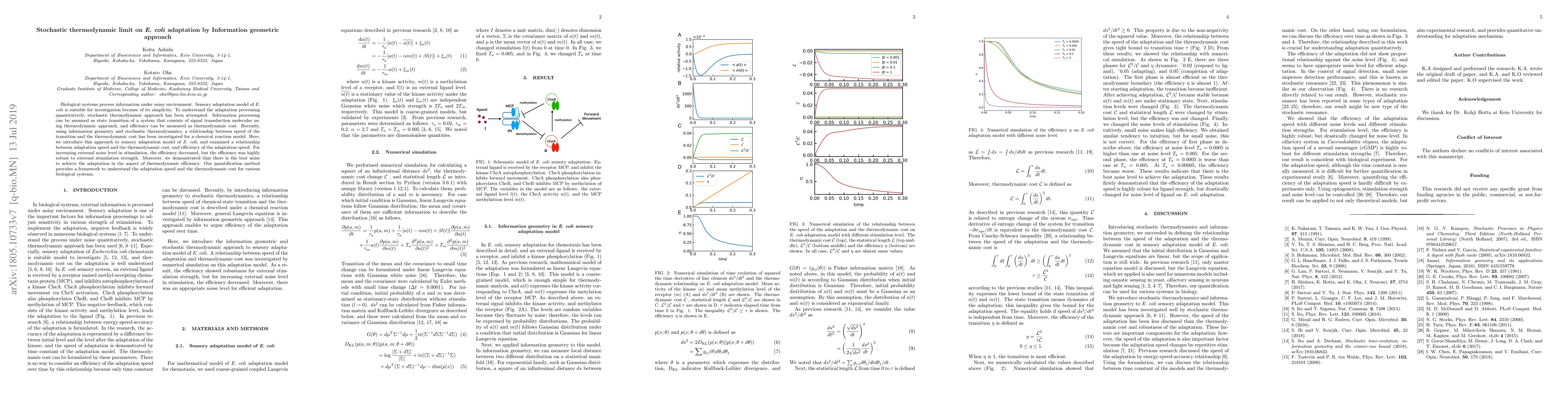 This paper applies an information geometric and stochastic thermodynamic approach to model E. coli's sensory adaptation, revealing a relationship between adaptation speed and thermodynamic cost. It finds that while efficiency decreases with higher noise, it remains robust to varying stimulation strength, and identifies an optimal noise level for maximum thermodynamic efficiency.
