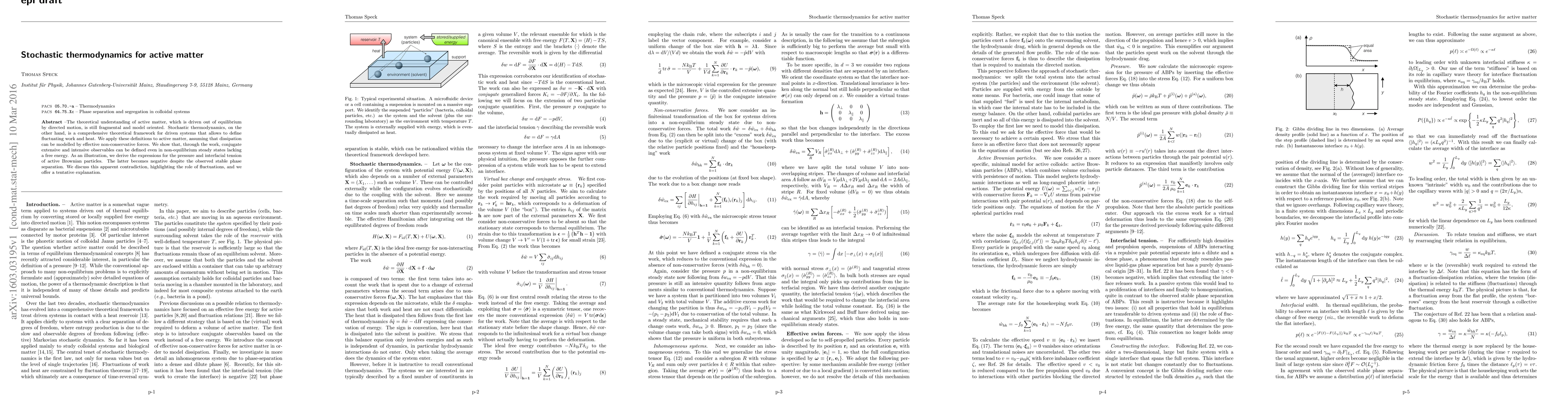 This paper applies stochastic thermodynamics to active matter, defining fluctuating work and heat to analyze non-equilibrium systems. It introduces extensive and intensive observables in steady states without free energy, and explains the negative interfacial tension in active Brownian particles, attributing it to fluctuations and offering a potential resolution.