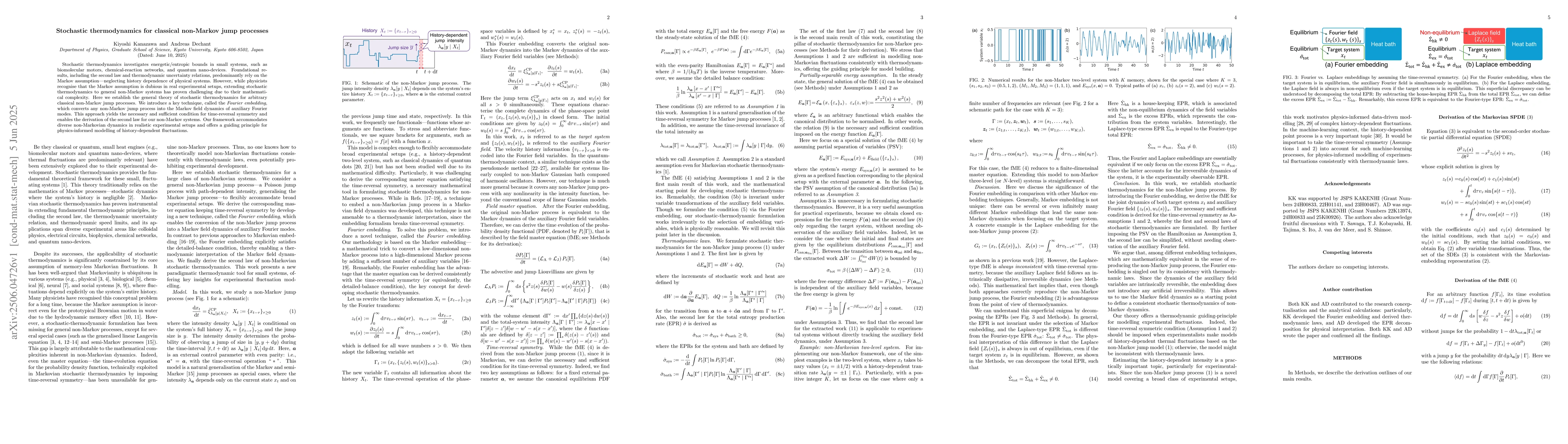 The research establishes the general theory of stochastic thermodynamics for arbitrary classical non-Markov jump processes, introducing a technique called 'Fourier embedding' to convert non-Markov jump processes into Markov field dynamics of auxiliary Fourier modes.