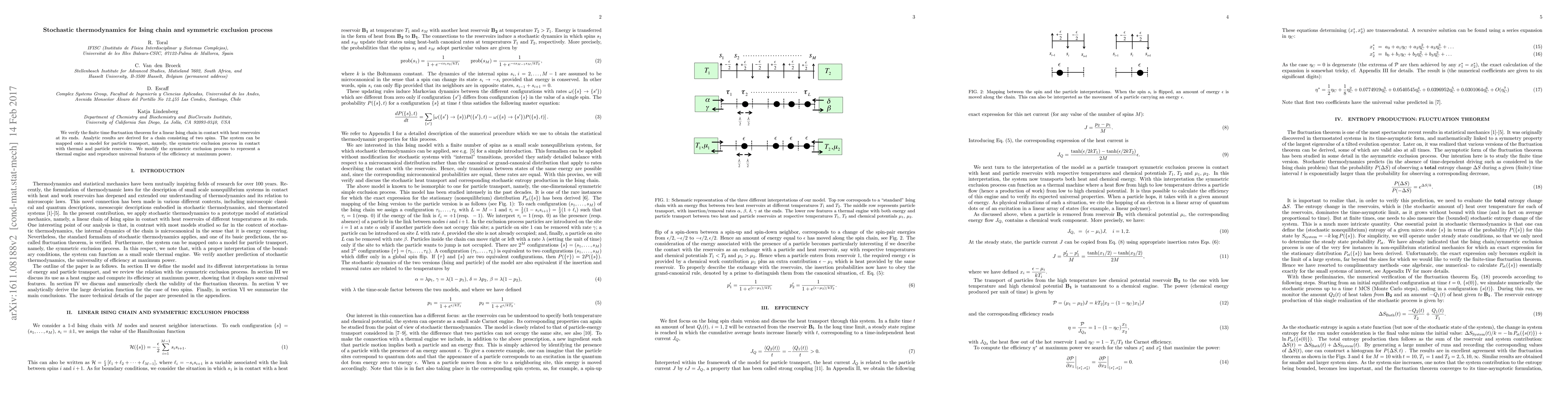 We verify the finite time fluctuation theorem for a linear Ising chain at its ends in contact with heat reservoirs. Analytic results are derived for a chain consisting of only two spins. The system can be mapped onto a model for particle transport, namely the symmetric exclusion process, in contact with thermal and particle reservoirs. We modify the symmetric exclusion process to represent a thermal engine and reproduce universal features of the efficiency at maximum power.
