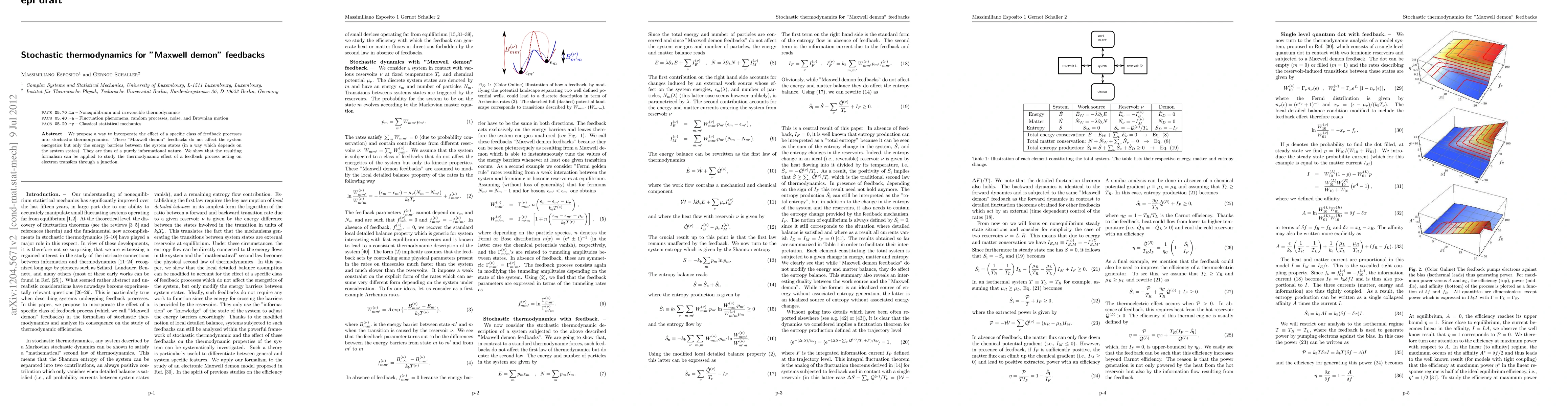 We propose a way to incorporate the effect of a specific class of feedback processes into stochastic thermodynamics. These "Maxwell demon" feedbacks do not affect the system energetics but only the energy barriers between the system states (in a way which depends on the system states). They are thus of a purely informational nature. We show that the resulting formalism can be applied to study the thermodynamic effect of a feedback process acting on electron transfers through a junction.