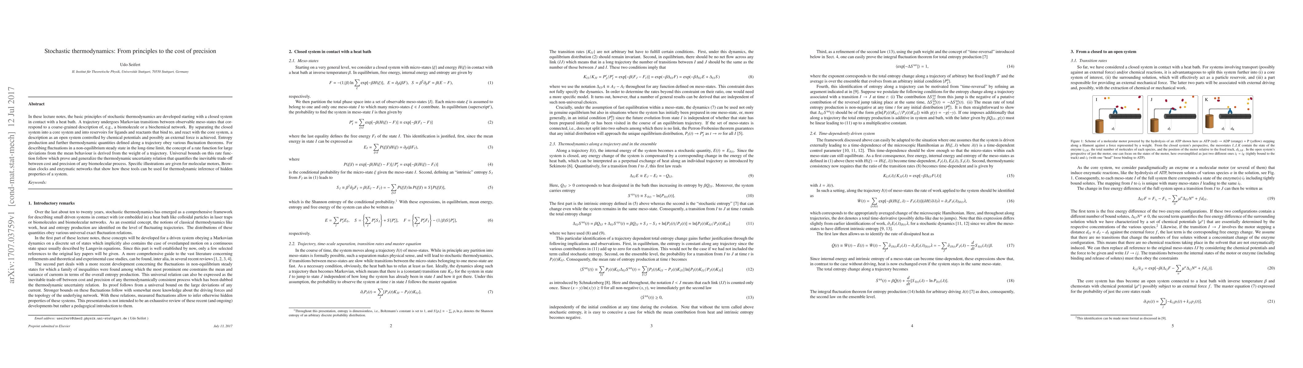 In these lecture notes, the basic principles of stochastic thermodynamics are developed starting with a closed system in contact with a heat bath. A trajectory undergoes Markovian transitions between observable meso-states that correspond to a coarse-grained description of, e.g., a biomolecule or a biochemical network. By separating the closed system into a core system and into reservoirs for ligands and reactants that bind to, and react with the core system, a description as an open system controlled by chemical potentials and possibly an external force is achieved. Entropy production and further thermodynamic quantities defined along a trajectory obey various fluctuation theorems. For describing fluctuations in a non-equilibrium steady state in the long-time limit, the concept of a rate function for large deviations from the mean behaviour is derived from the weight of a trajectory. Universal bounds on this rate function follow which prove and generalize the thermodynamic uncertainty relation that quantifies the inevitable trade-off between cost and precision of any biomolecular process. Specific illustrations are given for molecular motors, Brownian clocks and enzymatic networks that show how these tools can be used for thermodynamic inference of hidden properties of a system.