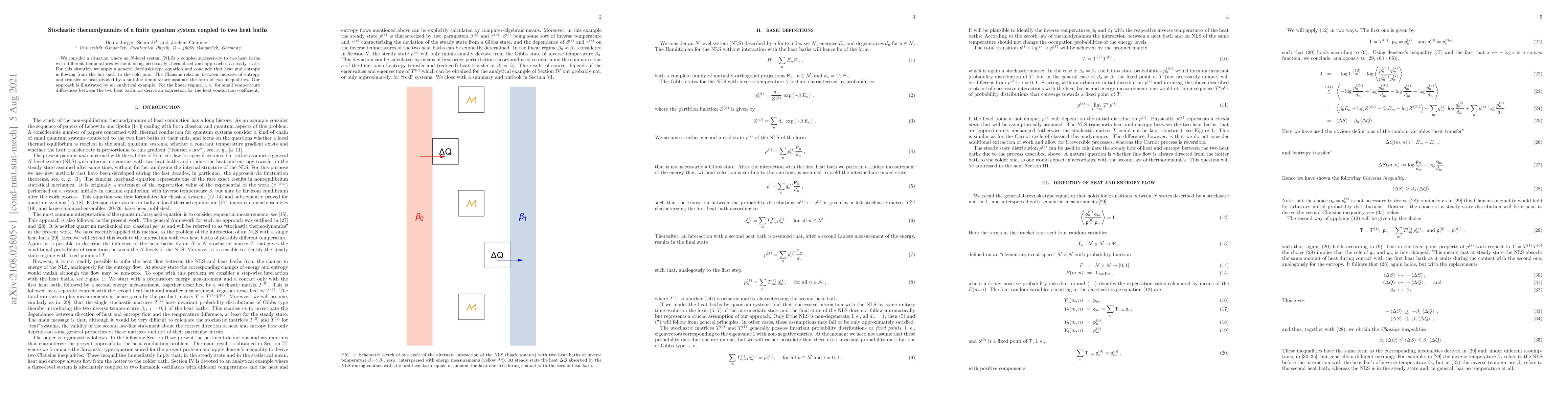 This paper explores the stochastic thermodynamics of a finite quantum system interacting with two heat baths at different temperatures, leading to a steady state. It applies a Jarzinski-type equation to show that heat and entropy flow from the hotter to the colder bath, establishing Clausius-like inequalities. An analytical example and a heat conduction coefficient expression for small temperature differences are provided.