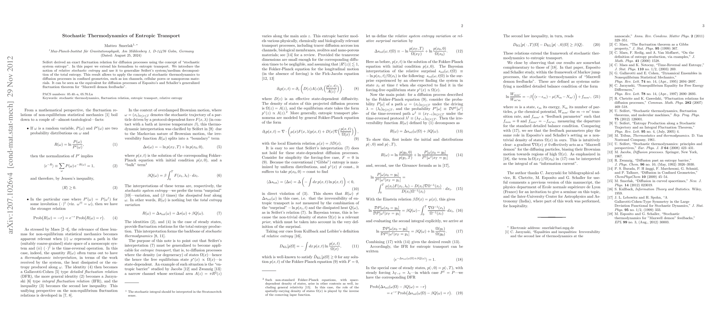 Seifert derived an exact fluctuation relation for diffusion processes using the concept of "stochastic system entropy". In this note we extend his formalism to entropic transport. We introduce the notion of relative stochastic entropy, or "relative surprisal", and use it to generalize Seifert's system/medium decomposition of the total entropy. This result allows to apply the concepts of stochastic thermodynamics to diffusion processes in confined geometries, such as ion channels, cellular pores or nanoporous materials. It can be seen as the equivalent for diffusion processes of Esposito and Schaller's generalized fluctuation theorem for "Maxwell demon feedbacks".