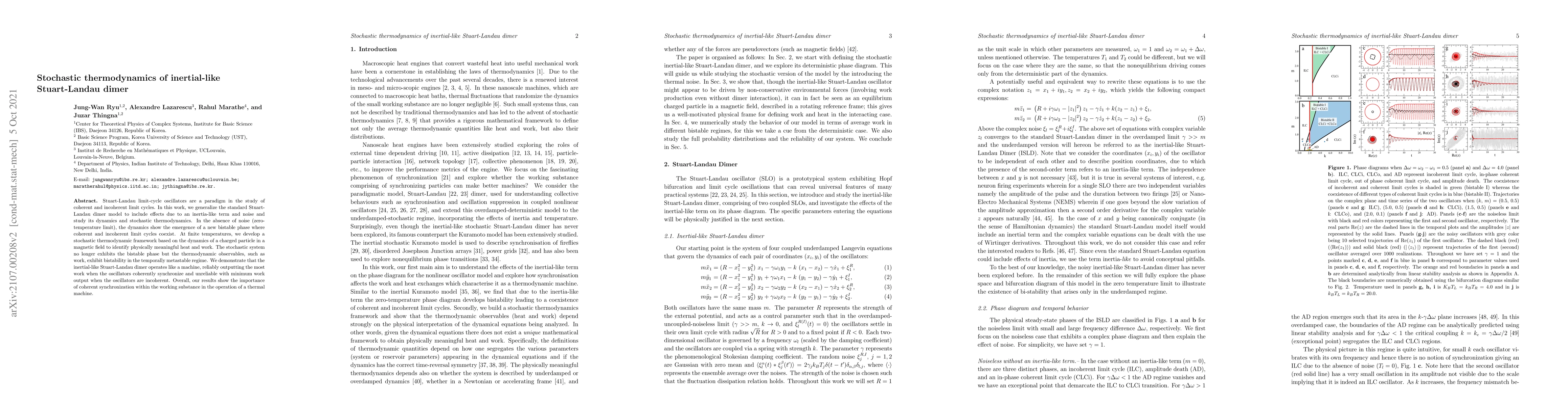 This paper generalizes the Stuart-Landau dimer model to include inertial effects and noise, revealing a new bistable phase at zero temperature. At finite temperatures, it develops a stochastic thermodynamic framework to analyze heat and work, showing that coherent synchronization maximizes work output, highlighting the role of coherence in thermal machines.