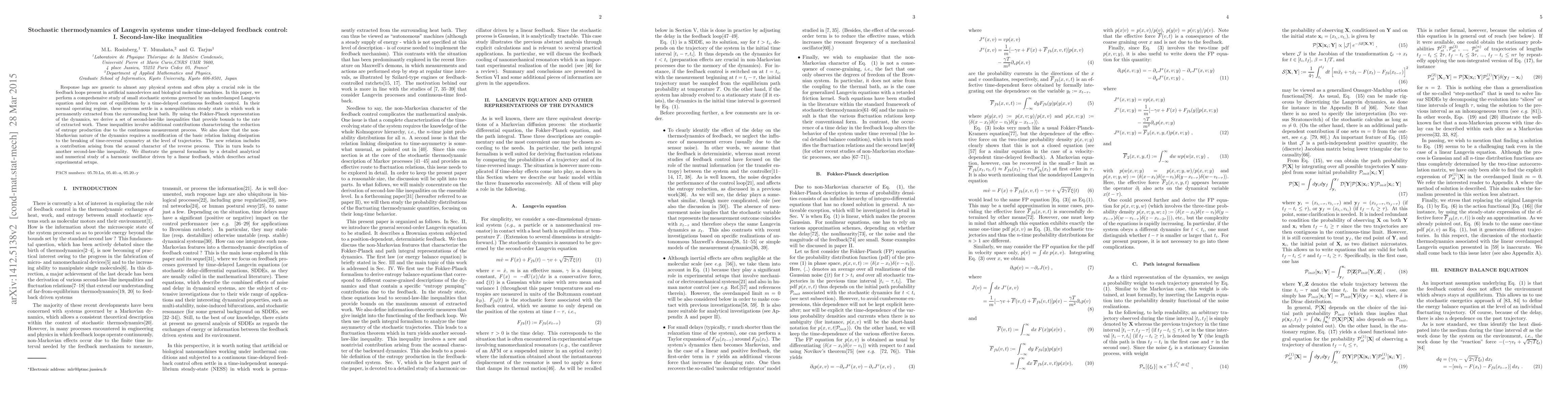 This paper investigates stochastic systems under time-delayed feedback control, deriving second-law-like inequalities that bound the rate of extracted work. It highlights the non-Markovian dynamics' impact on entropy production and introduces a modified relation between dissipation and time-reversal symmetry breaking, illustrated through a harmonic oscillator model.