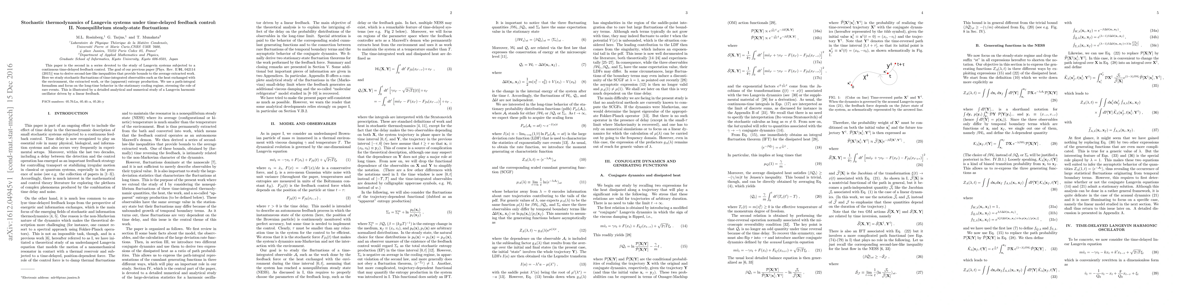 This paper is the second in a series devoted to the study of Langevin systems subjected to a continuous time-delayed feedback control. The goal of our previous paper [Phys. Rev. E 91, 042114 (2015)] was to derive second-law-like inequalities that provide bounds to the average extracted work. Here we study stochastic fluctuations of time-integrated observables such as the heat exchanged with the environment, the extracted work, or the (apparent) entropy production. We use a path-integral formalism and focus on the long-time behavior in the stationary cooling regime, stressing the role of rare events. This is illustrated by a detailed analytical and numerical study of a Langevin harmonic oscillator driven by a linear feedback.