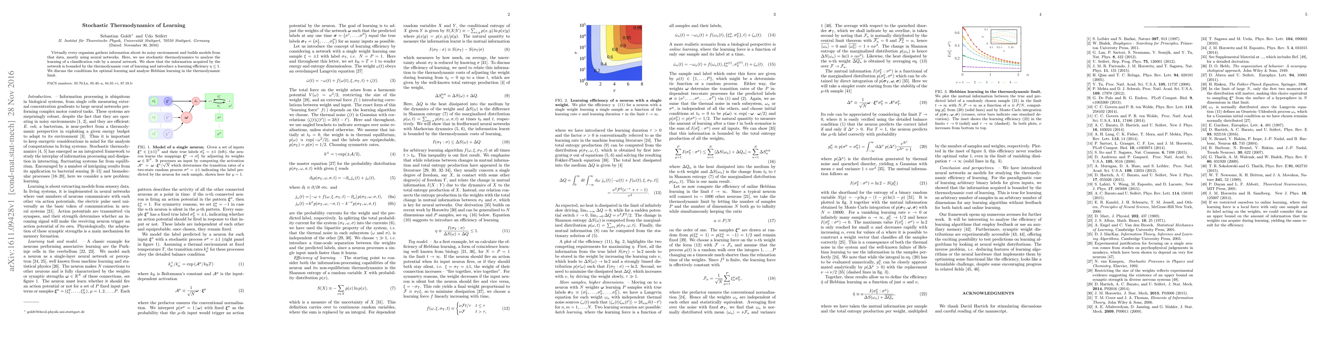 This paper employs stochastic thermodynamics to analyze neural network learning, demonstrating that the information gained is limited by the thermodynamic cost, introducing a learning efficiency $\eta \le 1$. It explores optimal learning conditions and examines Hebbian learning in large network limits.