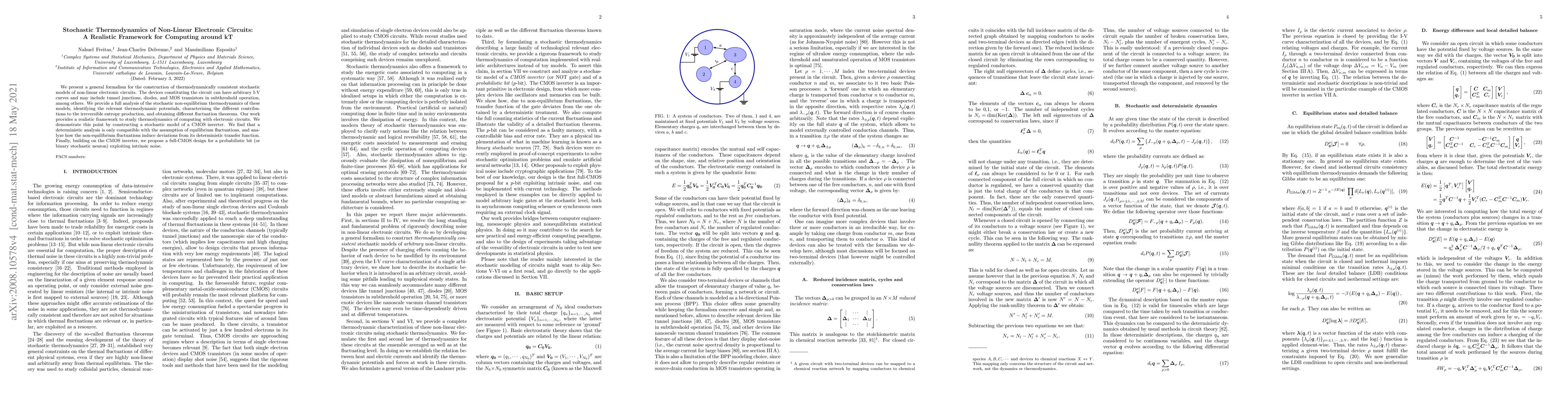 We present a general formalism for the construction of thermodynamically consistent stochastic models of non-linear electronic circuits. The devices constituting the circuit can have arbitrary I-V curves and may include tunnel junctions, diodes, and MOS transistors in subthreshold operation, among others. We provide a full analysis of the stochastic non-equilibrium thermodynamics of these models, identifying the relevant thermodynamic potentials, characterizing the different contributions to the irreversible entropy production, and obtaining different fluctuation theorems. Our work provides a realistic framework to study thermodynamics of computing with electronic circuits. We demonstrate this point by constructing a stochastic model of a CMOS inverter. We find that a deterministic analysis is only compatible with the assumption of equilibrium fluctuations, and analyze how the non-equilibrium fluctuations induce deviations from its deterministic transfer function. Finally, building on the CMOS inverter, we propose a full-CMOS design for a probabilistic bit (or binary stochastic neuron) exploiting intrinsic noise.