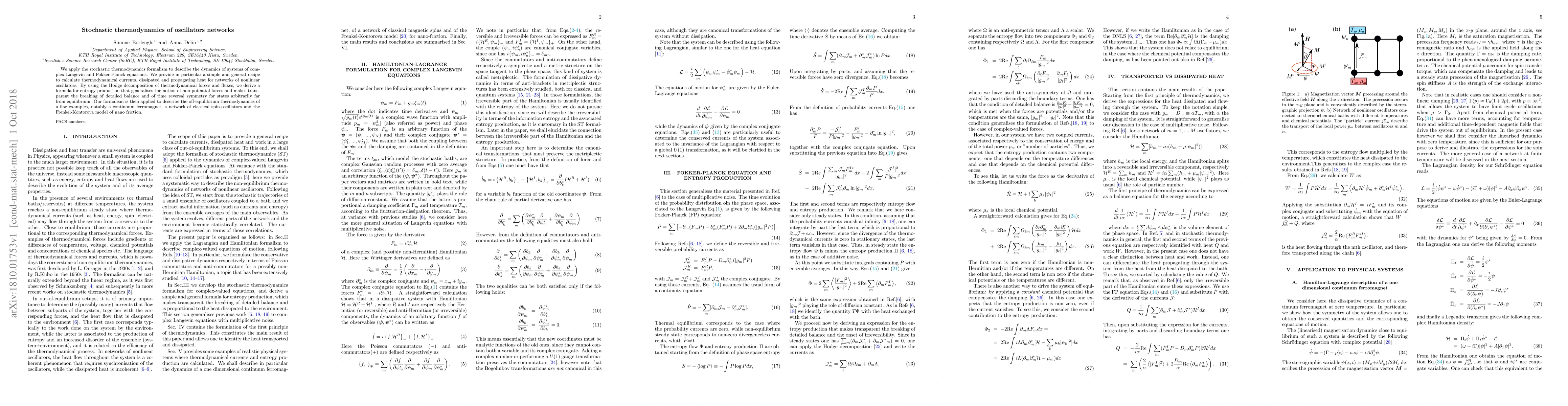 We apply the stochastic thermodynamics formalism to describe the dynamics of systems of complex Langevin and Fokker-Planck equations. We provide in particular a simple and general recipe to calculate thermodynamical currents, dissipated and propagating heat for networks of nonlinear oscillators. By using the Hodge decomposition of thermodynamical forces and fluxes, we derive a formula for entropy production that generalises the notion of non-potential forces and makes trans- parent the breaking of detailed balance and of time reversal symmetry for states arbitrarily far from equilibrium. Our formalism is then applied to describe the off-equilibrium thermodynamics of a few examples, notably a continuum ferromagnet, a network of classical spin-oscillators and the Frenkel-Kontorova model of nano friction.