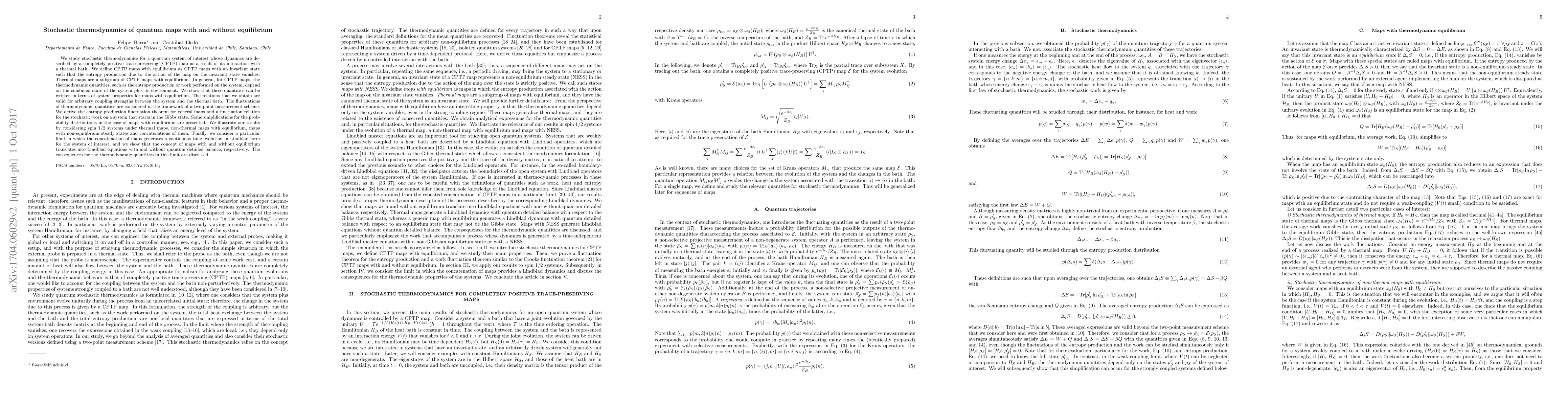 We study stochastic thermodynamics for a quantum system of interest whose dynamics are described by a completely positive trace-preserving (CPTP) map as a result of its interaction with a thermal bath. We define CPTP maps with equilibrium as CPTP maps with an invariant state such that the entropy production due to the action of the map on the invariant state vanishes. Thermal maps are a subgroup of CPTP maps with equilibrium. In general, for CPTP maps, the thermodynamic quantities, such as the entropy production or work performed on the system, depend on the combined state of the system plus its environment. We show that these quantities can be written in terms of system properties for maps with equilibrium. The relations that we obtain are valid for arbitrary coupling strengths between the system and the thermal bath. The fluctuations of thermodynamic quantities are considered in the framework of a two-point measurement scheme. We derive the entropy production fluctuation theorem for general maps and a fluctuation relation for the stochastic work on a system that starts in the Gibbs state. Some simplifications for the probability distributions in the case of maps with equilibrium are presented. We illustrate our results by considering spin 1/2 systems under thermal maps, non-thermal maps with equilibrium, maps with non-equilibrium steady states and concatenations of them. Finally, we consider a particular limit in which the concatenation of maps generates a continuous time evolution in Lindblad form for the system of interest, and we show that the concept of maps with and without equilibrium translates into Lindblad equations with and without quantum detailed balance, respectively. The consequences for the thermodynamic quantities in this limit are discussed.