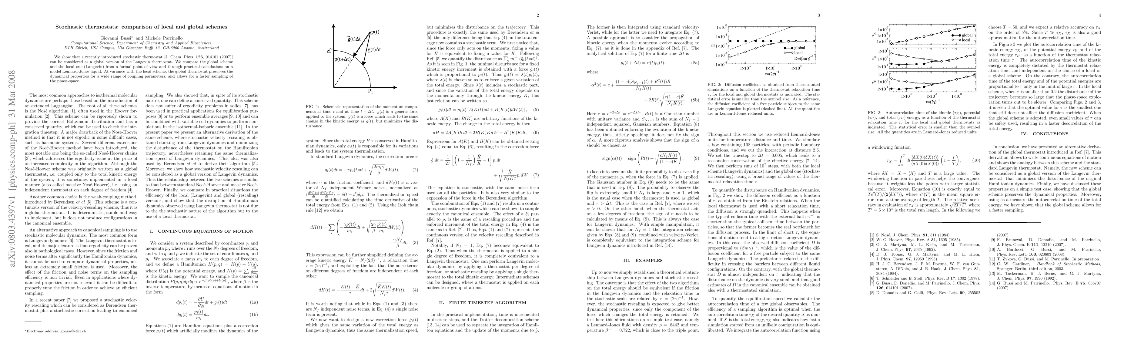 We show that a recently introduced stochastic thermostat [J. Chem. Phys. 126 (2007) 014101] can be considered as a global version of the Langevin thermostat. We compare the global scheme and the local one (Langevin) from a formal point of view and through practical calculations on a model Lennard-Jones liquid. At variance with the local scheme, the global thermostat preserves the dynamical properties for a wide range of coupling parameters, and allows for a faster sampling of the phase-space.