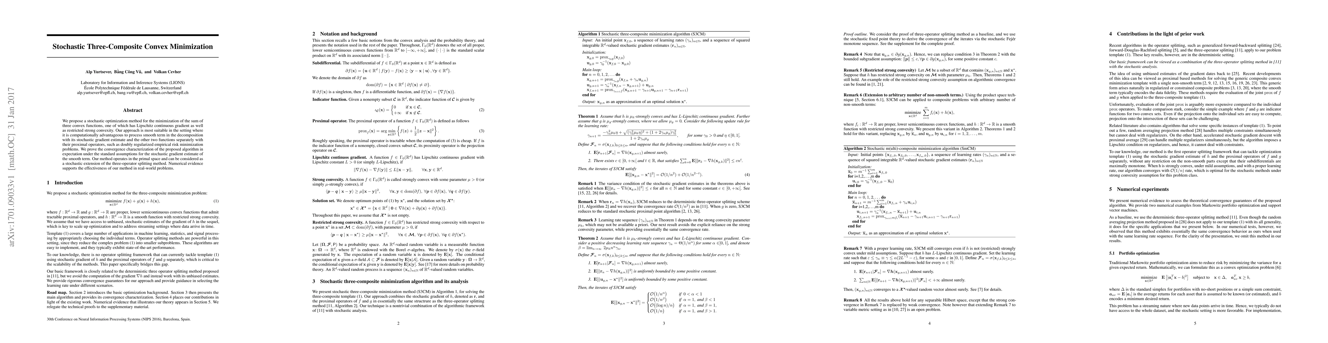 This paper proposes a stochastic optimization method for minimizing the sum of three convex functions, with a focus on processing a smooth term separately from the other two. The method extends the three-operator splitting approach and is shown to converge under standard assumptions, with numerical evidence demonstrating its effectiveness in practical applications.