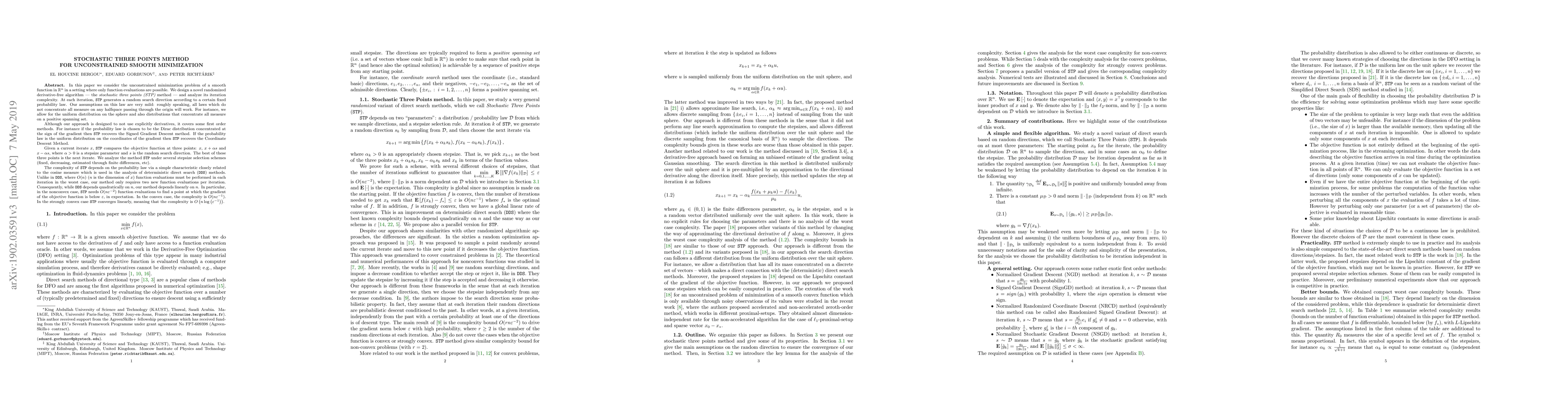In this paper we consider the unconstrained minimization problem of a smooth function in ${\mathbb{R}}^n$ in a setting where only function evaluations are possible. We design a novel randomized derivative-free algorithm --- the stochastic three points (STP) method --- and analyze its iteration complexity. At each iteration, STP generates a random search direction according to a certain fixed probability law. Our assumptions on this law are very mild: roughly speaking, all laws which do not concentrate all measure on any halfspace passing through the origin will work. For instance, we allow for the uniform distribution on the sphere and also distributions that concentrate all measure on a positive spanning set. Given a current iterate $x$, STP compares the objective function at three points: $x$, $x+\alpha s$ and $x-\alpha s$, where $\alpha>0$ is a stepsize parameter and $s$ is the random search direction. The best of these three points is the next iterate. We analyze the method STP under several stepsize selection schemes (fixed, decreasing, estimated through finite differences, etc). We study non-convex, convex and strongly convex cases.