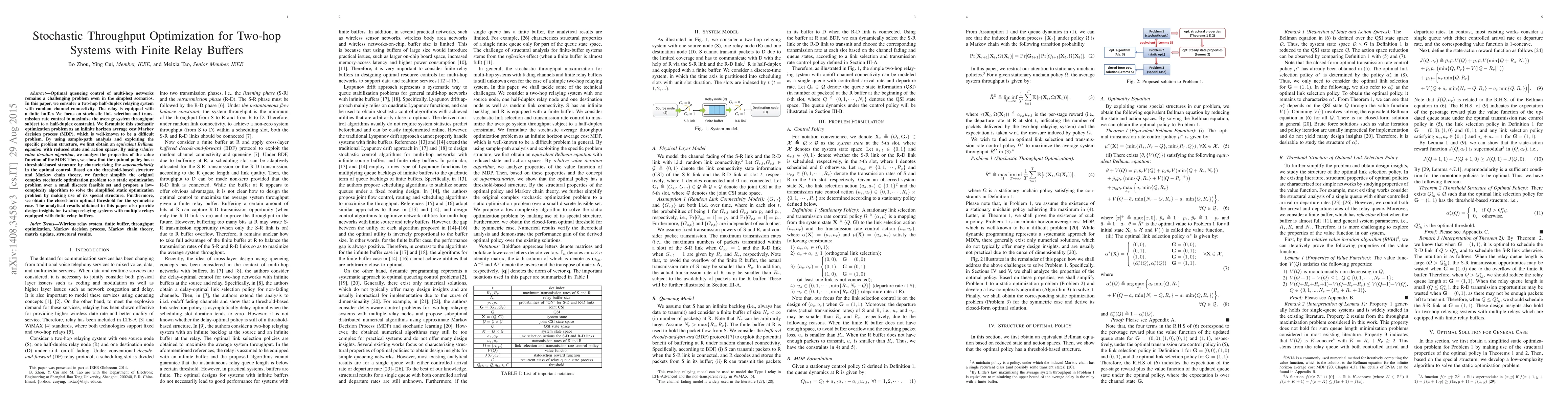 This paper optimizes throughput in two-hop relay systems with finite buffers by formulating the problem as an infinite horizon average cost Markov decision process. It simplifies the problem using a threshold-based structure and relative value iteration, leading to a low-complexity algorithm for solving the optimized static problem.